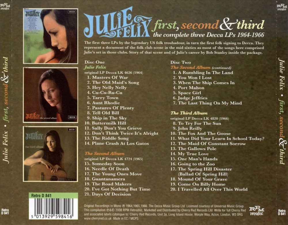 Additional Information from InnerSleeve Product Description Liner Note Author: Bob Stanley . Arranger: Harry Robinson. Although California-born, Julie Felix found herself in Britain smack dab in the middle of the folk revival in the mid-'60s, and with her serviceable voice and exotic good looks, she was soon a poster girl for the U.K. scene itself, releasing an album a year for Decca Records between 1964 and 1966, all three of which are collected here in this two-disc set. Felix wasn't Joan Baez or Judy Collins, however tempting it might be to make those comparisons, and her albums sound a bit like live sets tracked in the studio, with little embellishment, giving them at times a kind of a those-were-the-days documentary feel. Felix's faintly husky voice sounds fine but gets a bit generic, and the same could be said of her guitar playing, and she sounded pretty much like a thousand other female folk singers on the scene at the time trying their hand at "The Riddle Song." But what Felix did have was a fine ear for recognizing a good contemporary folk song, and these three LPs are full of songs by the likes of Bob Dylan, Ian Tyson, Tom Paxton, Phil Ochs, Donovan, and Bert Jansch, among others, as well as several selections from the Woody Guthrie songbook. Nothing here really sets the world on fire, but Felix rises well above the ordinary on versions of Jansch's "Needle of Death," Tyson's "Someday Soon," and a jaunty take on Donovan's "To Try for the Sun," and she's never less than pleasant on more traditional fare like "The Maid of Constant Sorrow" or "The Riddle Song." In the end, though, she's more of a flashback to a particular time and place than she is an enduring folk icon, which doesn't diminish what's here, but it hardly makes it essential, unless, of course, you really want to hear "The Riddle Song" one more time. A timepiece. ~ Steve Leggett About InnerSleeve We offer unbeatable prices, quick shipping times and a wide selection of vinyl. Purchases come with a 30-day Satisfaction Guarantee (minus Shipping & Handling fees) on all unopened products. All items are from licensed Distributors. We do not deal with any Bootleg or Used items!
