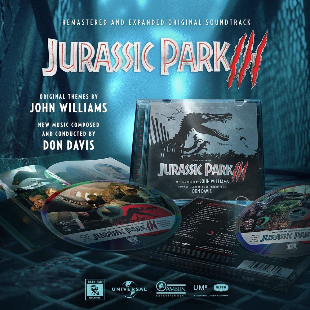 La-La Land Records, Universal Pictures, Amblin Entertainment, Universal Music Group and Decca Records present JURASSIC PARK III, a limited edition 2-CD remastered and expanded presentation of acclaimed composer Don Davis’ (THE MATRIX, THE MATRIX RELOADED, BOUND) original motion picture score to the blockbuster second sequel in the legendary JURASSIC PARK franchise, starring Sam Neill, William H. Macy and Tea Leoni, and directed by Joe Johnston. Expertly interpolating, and building on, maestro John Williams’ iconic JURASSIC themes, composer Davis propels the film’s excitement even further with his own powerhouse, original orchestral material. Expanded and sounding better than ever, JURASSIC PARK III shines brilliantly – it’s robust, thematic high-octane film scoring that finally gets to shine in full within this deluxe release. Produced by Mike Matessino and Neil S. Bulk, newly edited by Bulk and mixed and mastered by Matessino from the original 24 bit film mixes, this 2-CD presentation showcases the original 2001 soundtrack release remastered on Disc 1, with the expanded film score spread across both discs, concluding with additional tracks on Disc 2. The exclusive, in-depth liner notes are by John Takis, including new comments from the composer, while the sharp art design is by Jim Titus, continuing the eye-catching style he employed for our JURASSIC PARK and THE LOST WORLD re-issues. This is a limited edition of 3000 Units. TRACK LISTING: DISC 1 ORIGINAL SOUNDTRACK ALBUM (54:28) 1 Isla Sorna Sailing Situation 4:21 2 The Dinosaur Fly-By 2:13 3 Cooper’s Last Stand 1:59 4 The Raptor Room 2:35 5 Raptor Repartee 3:04 6 Tree People 2:00 7 Pteranodon Habitat 3:01 8 Tiny Pecking Pteranodons 3:34 9 Billy Oblivion 2:49 10 Brachiosaurus On The Bank 2:05 11 Nash Calling 3:36 12 Bone Man Ben 7:18 13 Frenzy Fuselage 3:58 14 Clash Of Extinction 1:39 15 The Hat Returns / End Credits 5:07 16 Big Hat, No Cattle 4:24 Performed by Randy Newman SCORE PRESENTATION (85:07) 17 Isla Sorna Sailing Situation (Film Version) 4:26 18 Dinosaur Man 1:43 19 Udesky, Nash And Cooper 2:29 20 The Raptor Bone 1:18 21 Raptor In The Cabin 1:52 22 The Dinosaur Fly-By (Film Version) 2:28 23 Cooper’s Last Stand (Extended Version) 2:52 24 Frenzy Fuselage (Extended Version) 4:08 25 Clash Of Extinction 1:40 DISC 1 TOTAL TIME: 77:40 DISC 2 SCORE PRESENTATION CONT’D 1 Kirby Paint And Tile Plus 4:07 2 Bone Man Ben (Film Version) 3:39 3 Raptor Eggs 2:54 4 The Raptor Room (Film Version) 2:44 5 Raptor Repartee (Film Version) 3:28 6 Eric To The Rescue 1:52 7 Tree People (Film Version) 2:02 8 Nash Calling 3:36 9 Party Crasher 3:16 10 Pteranodon Habitat 3:01 11 Tiny Pecking Pteranodons (Film Version) 3:24 12 Billy Oblivion (Film Version) 2:54 13 Brachiosaurus On The Bank 2:05 14 Reaching For Glory 2:32 15 River Rampage 2:13 16 Paul Makes The Leap 2:59 17 River Reminiscence 1:07 18 Raptor Harassment 3:41 19 The Hat Returns / End Credits (Extended Version) 10:02 ADDITIONAL MUSIC (13:14) 20 Dinosaur Man (Alternate) 1:43 21 Raptor In The Cabin (Alternate) 1:52 22 Cooper’s Last Stand (Alternate) 2:38 23 Clash Of Extinction (Alternate Opening) 1:46 24 River Rampage (Alternate Ending) 2:11 25 River Reminiscence (Alternate Ending) 1:08 26 Dinosaur Man (With Choir) 1:44 DISC 2 TOTAL TIME: 75:18 TOTAL 2-DISC TIME: 2:32:58 This is a CD format release.