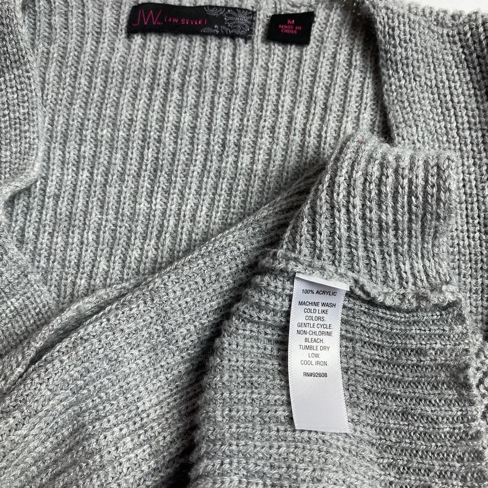 JW Style Women’s Faux Wrap Long Sleeve Deep V Sweater. 17” across underarms 21” shoulder to bottom back 18.5” shoulder to bottom of sleeve 100% soft acrylic