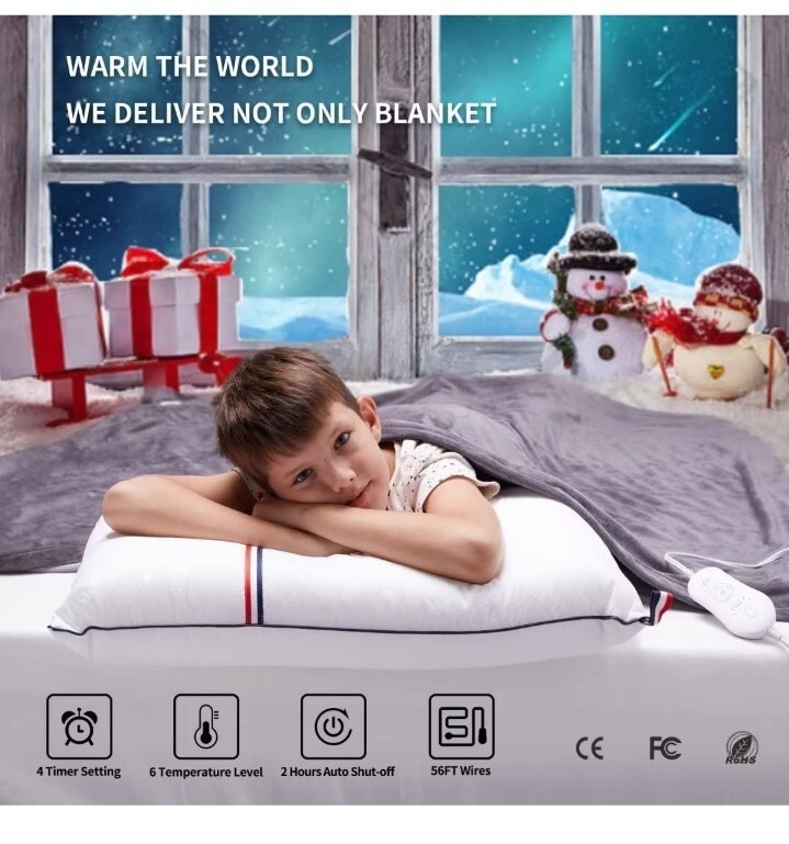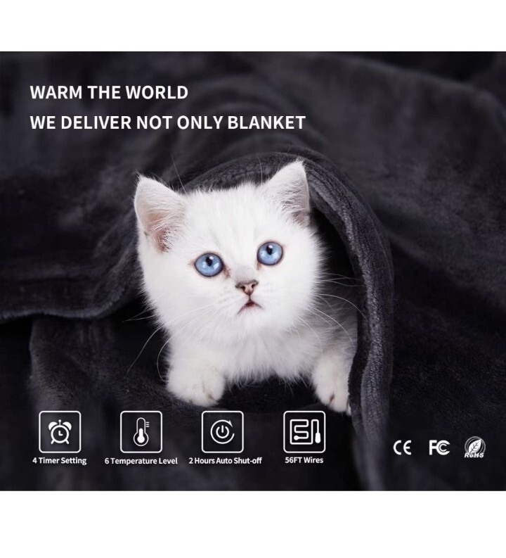 JY Fit All Heated Throw Blanket-Soft Velvet Christmas Throw Blanket,6 Heat.... Comfortable Features : 6 temperature levels from 104‘ F to 140'F provide varied heating preference to satisfy different needs on temperature to throw blanket. 4 time settings of 0.5h, 1h, 1.5h, 2h for multiple timing selection. Ideally fit for both day and night. High Quality Fabric : 1.5mm length super cozy velvet grey throw blanket offers soft, light and comfortable touch feeling. Washable fabric feature makes the house chore no longer an issue and also makes this electric throw blanket not a normal heated blanket but an life essential. Energy Saving : 0.15KWH per hour usage ultimately save your energy bill. This electric blanket is a Perfect Christmas throw blanket gift for the season. Safety Warranty : Heated throw blanket electric with FCC , CE and RoHs certified. PTC/NTC heating wire provide dual protection and 2 hours overheating auto shut off guarantee the safe use of the blanket. Plug in the cord first before connect the power. Easy Care : Disconnect the controller from power cables and place the blanket in the washer. Using cold or lukewarm water is preferred for better care to the heated throw. Completely dry before connect the power. Multiple folding layers when heating are not recommended. Do not dry clean the blanket. Power off when overheating.