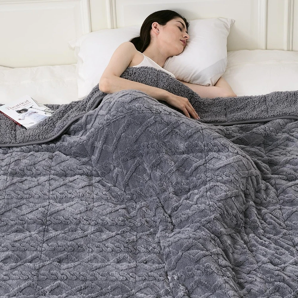 This weighted blanket is a game-changer—super soft, breathable, and just the right weight for deep relaxation. The double-sided sherpa feels like a cozy hug, while the 3D knit design adds a stylish touch to any room. Perfect for year-round comfort, it helps me sleep better without overheating. The size is ideal for curling up on the couch or staying warm in bed. Highly recommend for anyone needing stress relief or extra comfort!