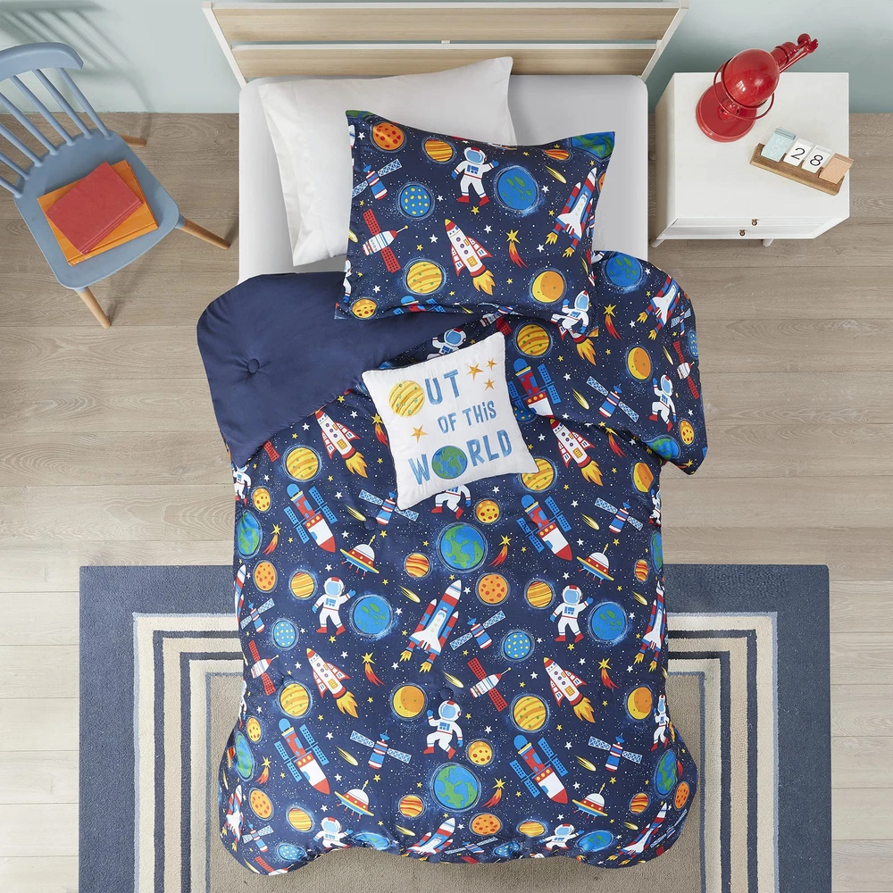 Blast off to dreamland with the Jason Outer Space Comforter Set. The ultra-soft comforter and shams (1 in Twin/TwinXL) feature a fun space print with spaceships, astronauts, and planets to create an awesome galaxy to explore. A square decorative pillow is also included adding the perfect finishing touch to the comforter set. Blast off to dreamland with the Jason Outer Space Comforter Set. Fantasy theme comforter features a fun space print with rocket spaceships, astronauts, and planets to create an awesome galaxy to explore. Two matching shams (1 in Twin/TwinXL) complement the comforter, while a decorative pillow complete the fun design. Set includes: 1 Comforter: 66"W x 86"L, 1 Standard Sham: 20"W x 26" L + 1"D, 1 Pillow: 16"W x 16"L Care Instruction: For your convenience it's machine washable. Do not use bleach. Pillow spot clean only. Commercial size washer and dryer is recommended for best result.