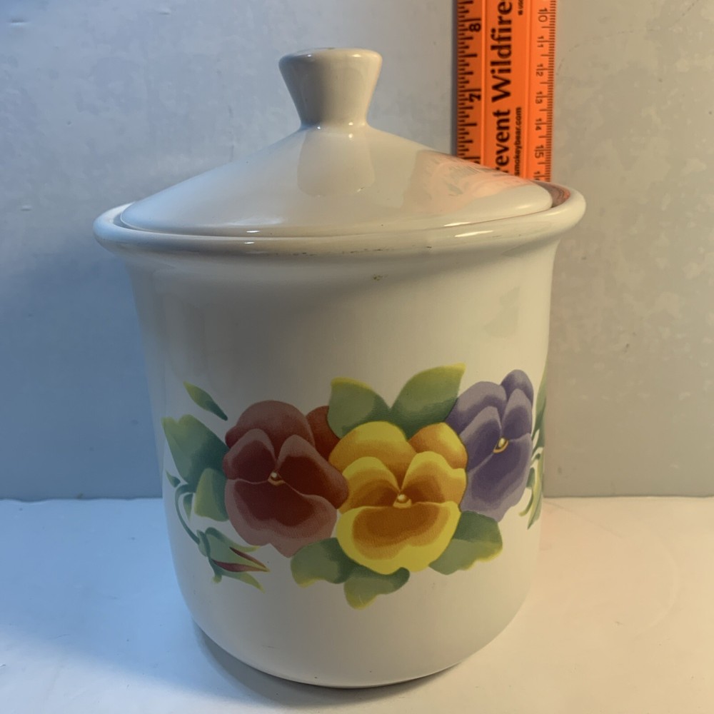 UP FOR SALE: Jay Corning Corelle: SUMMER BLUSH Pansies: 7.5" Canister w/ Lid and Seal Will securely ship via the USPS from my smoke free home. I offer both Ground and Priority options. Please reach out with any questions.