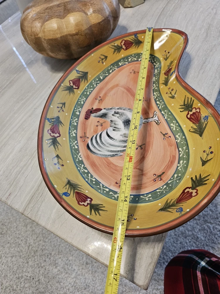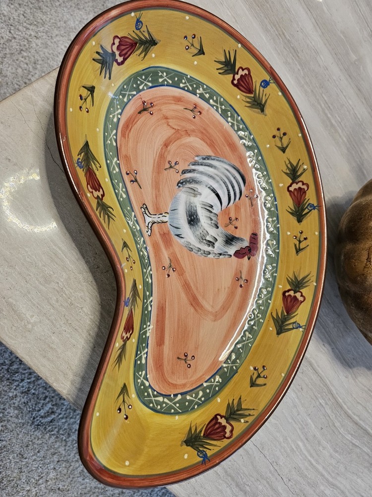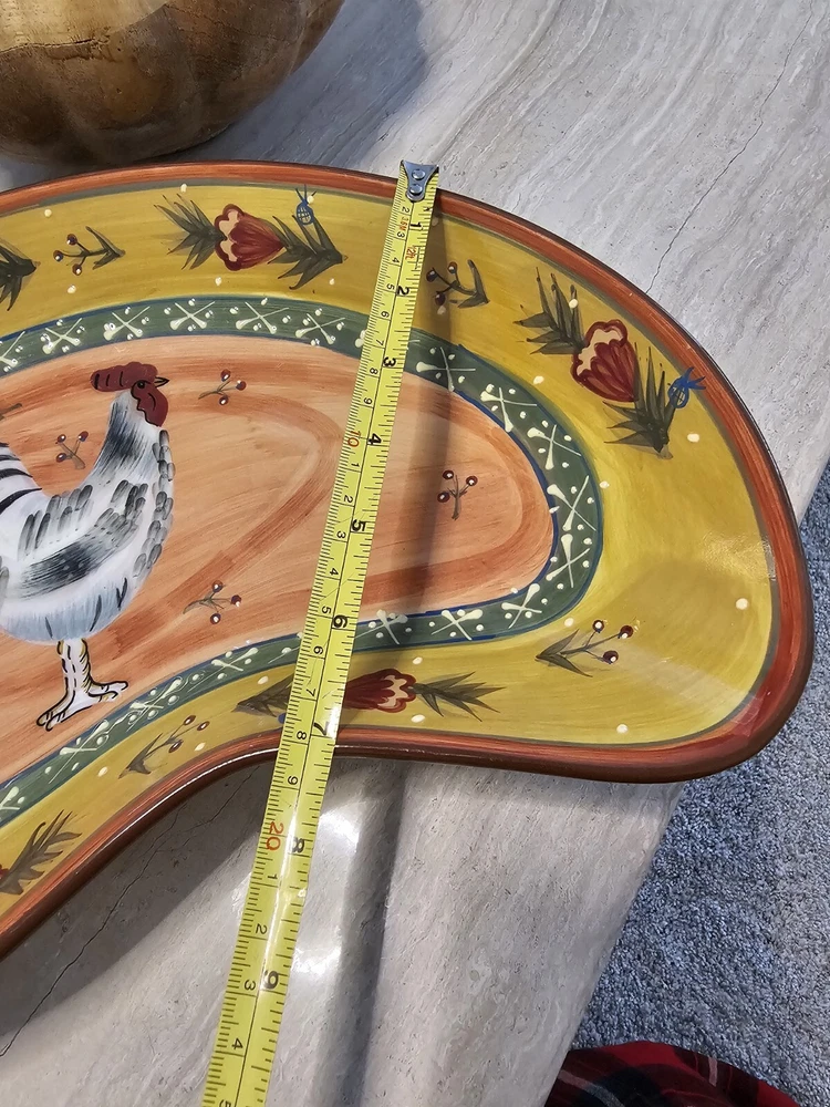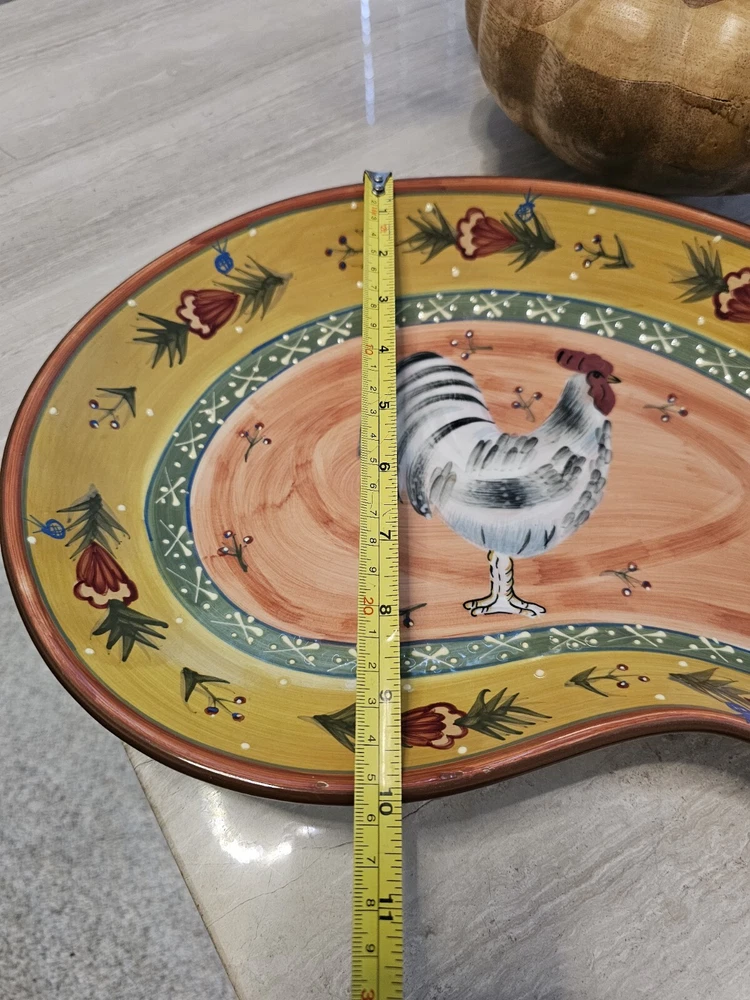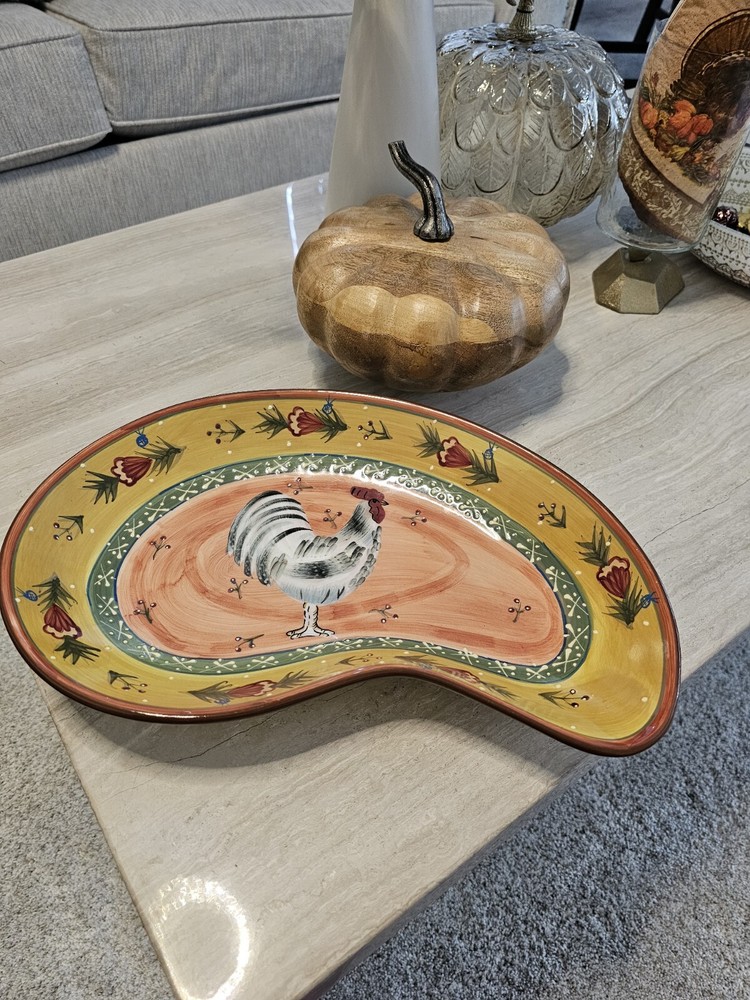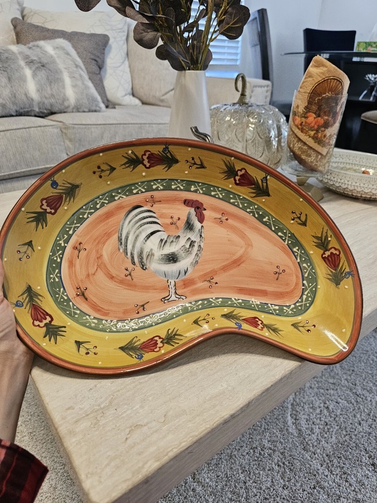 Absolutely love this charming rooster bowl! The hand-painted design is vibrant and adds a rustic farmhouse feel to my kitchen. Perfect for serving snacks or as a decorative piece—great condition and sturdy despite being pre-owned. Shipping was fast and the size is ideal for gatherings. A fantastic find for vintage lovers!