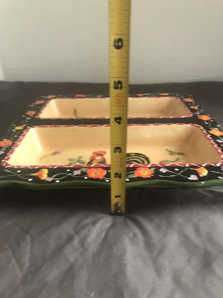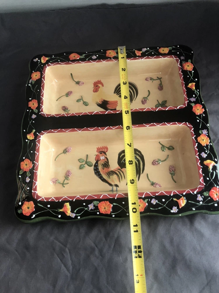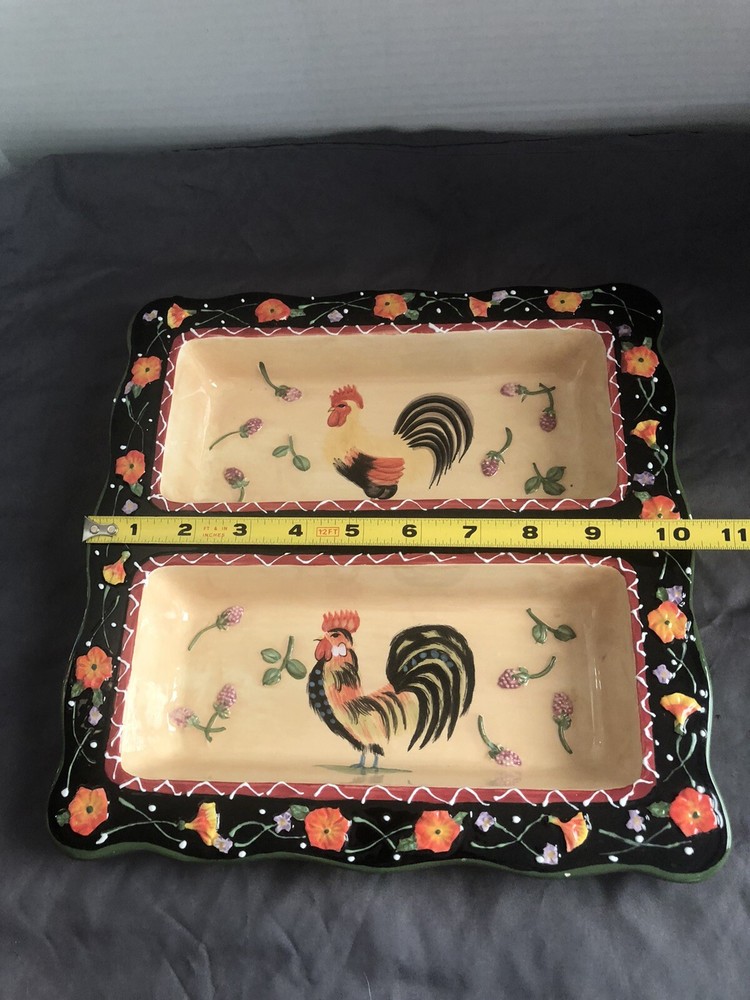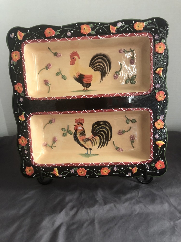 Jay Imports Ceramic 2 Section Serving Tray Rooster Design. **Here for sale is a lovely country or farm style ceramic tray-the features includes roosters abs a floral trim in good condition. Please see pics for personal judgment **