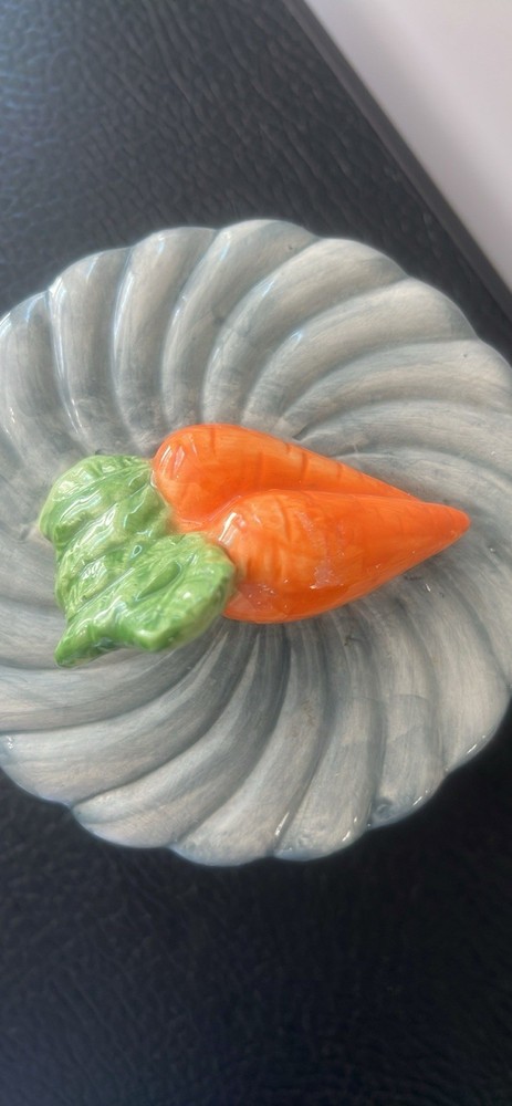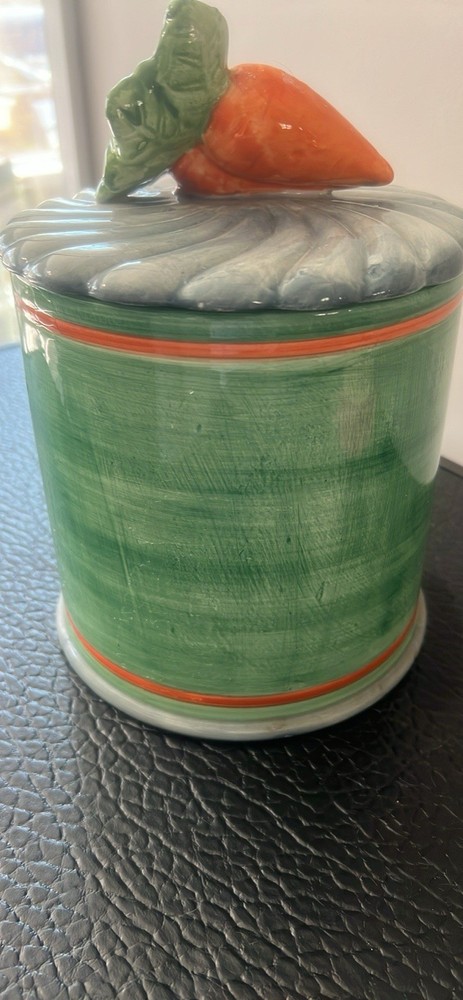 The Jay Imports Large Canister Cookie Jar with a carrot design is a charming addition to any kitchen. Made of ceramic, this large jar is perfect for storing cookies or other small snacks. The vibrant carrot design adds a playful touch to the overall look, making it both functional and decorative. Perfect for collectors or those looking to add a unique piece to their kitchen storage and organization collection. Size: with lid 10” tall 6.5” tall without lid and 6.25” wide