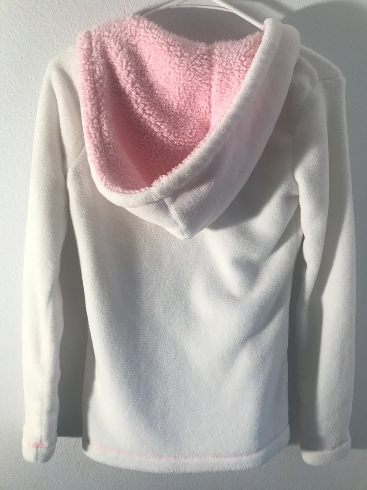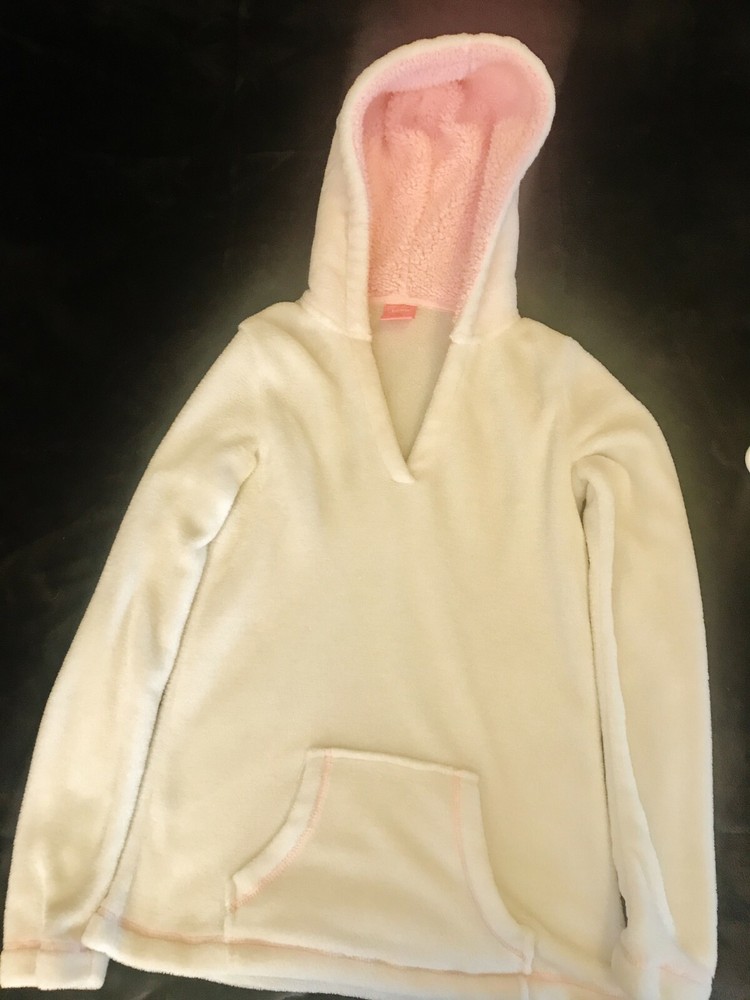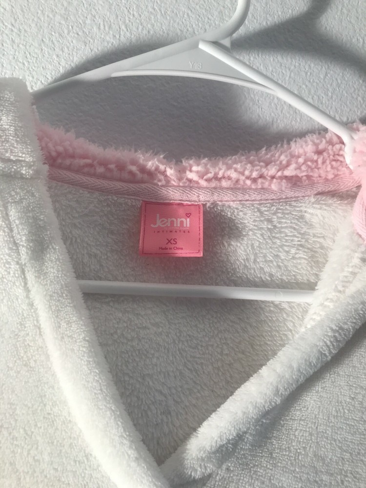 Jenni Intimates Fuzzy Soft Fleece Hoodie, White with Pink Trim, Size XS. Condition is "Pre-owned". Shipped with USPS First Class Mail....