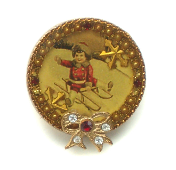 This pin is preowned from the Maximal Art collection designed by artist John Wind. This pin is from my personal collection and is in very good condition with light signs of use on the resin surface. Pin measures approximately 1.25" wide. Pin will come in a gift box, ready for gift giving. "Maximal Art collectibles feature whimsical collages of vintage photos, love letters, hand stamped letters and pressed flowers. The handmade pieces are set in 14 karat gold plate over pewter frames, sealed with liquid crystal, and set with Austrian crystals and glass pearls."