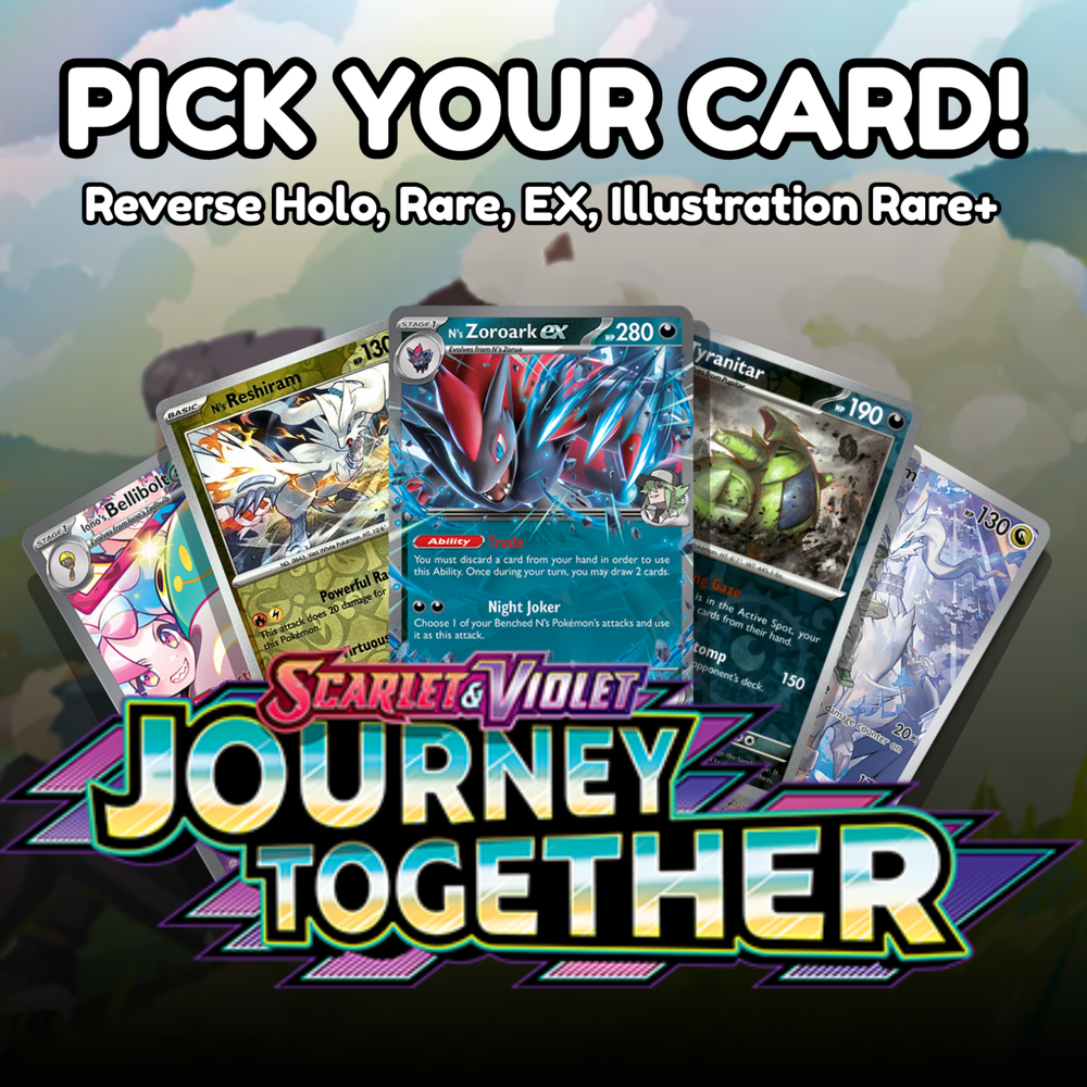 🌍 Pokémon Journey Together – Pick Your Card – Reverse Holo, EX, Rare, IR+ – NM Condition : Near Mint (NM) – Pack Fresh Set : Scarlet & Violet – Journey Together (SV6.5) Card Types Available : Reverse Holos, Holo Rares, Double Rares, ex Cards, Illustration Rares, Ultra Rares, Hyper Rares 🚨 Build your binder or battle-ready deck with cards from Pokémon’s Journey Together , the latest Scarlet & Violet set! This listing lets you choose exactly the singles you need , including Reverse Holo commons, playable rares, collectible ex cards, and stunning Illustration Rares — all in Near Mint condition. 🔍 Card Options Available : ✅ Reverse Holo Commons & Uncommons ⭐ Holo Rares & Reverse Holo Rares 💥 ex & Double Rares 🎨 Illustration Rare (IR) & Special Illustration Rare (SIR) 🌈 Ultra Rare & Hyper Rare Trainers 📦 Shipping & Handling : 🛡️ All cards ship sleeved and protected 💌 PWE shipping for orders under $20 📦 Tracked shipping upgrades automatically for higher value or bulk 🛒 Why Buy From Us : 100% authentic Pokémon TCG cards from sealed product Fast handling & excellent packaging Trusted seller with top-rated feedback Bundle discounts automatically apply at checkout Ideal for players, collectors, and master set builders