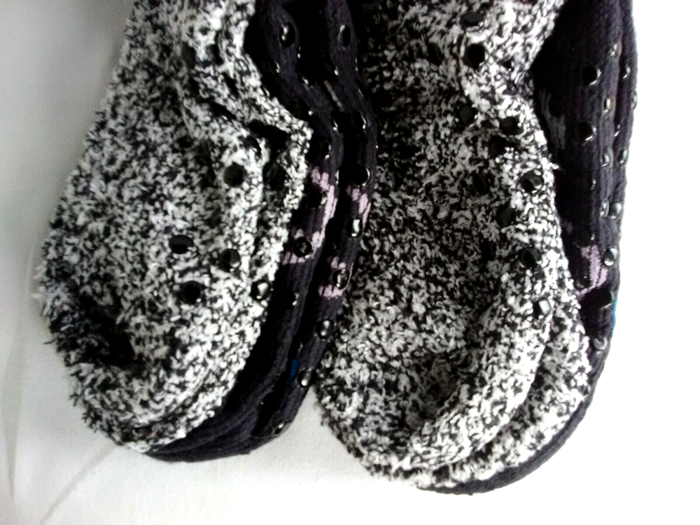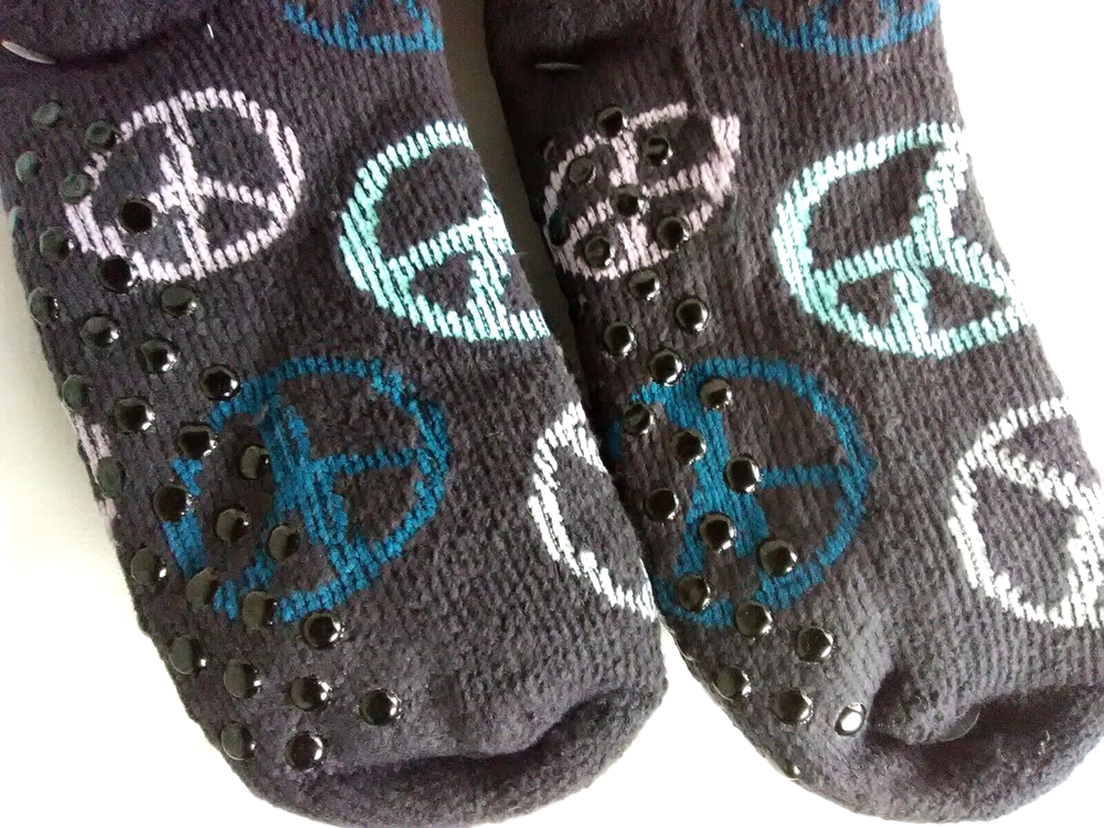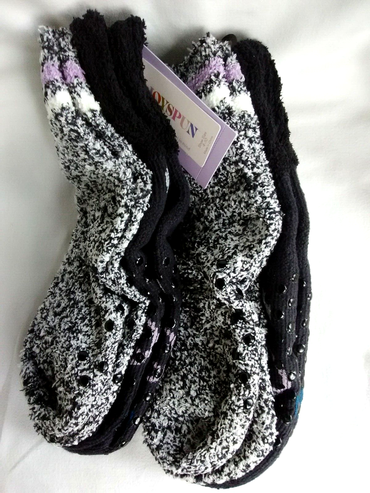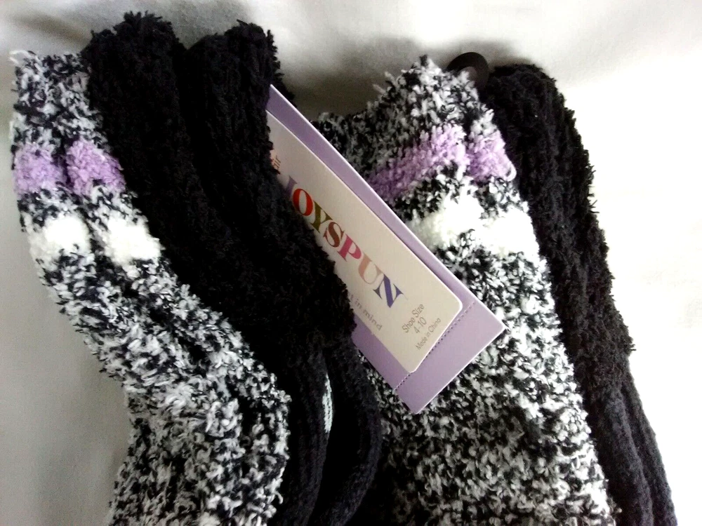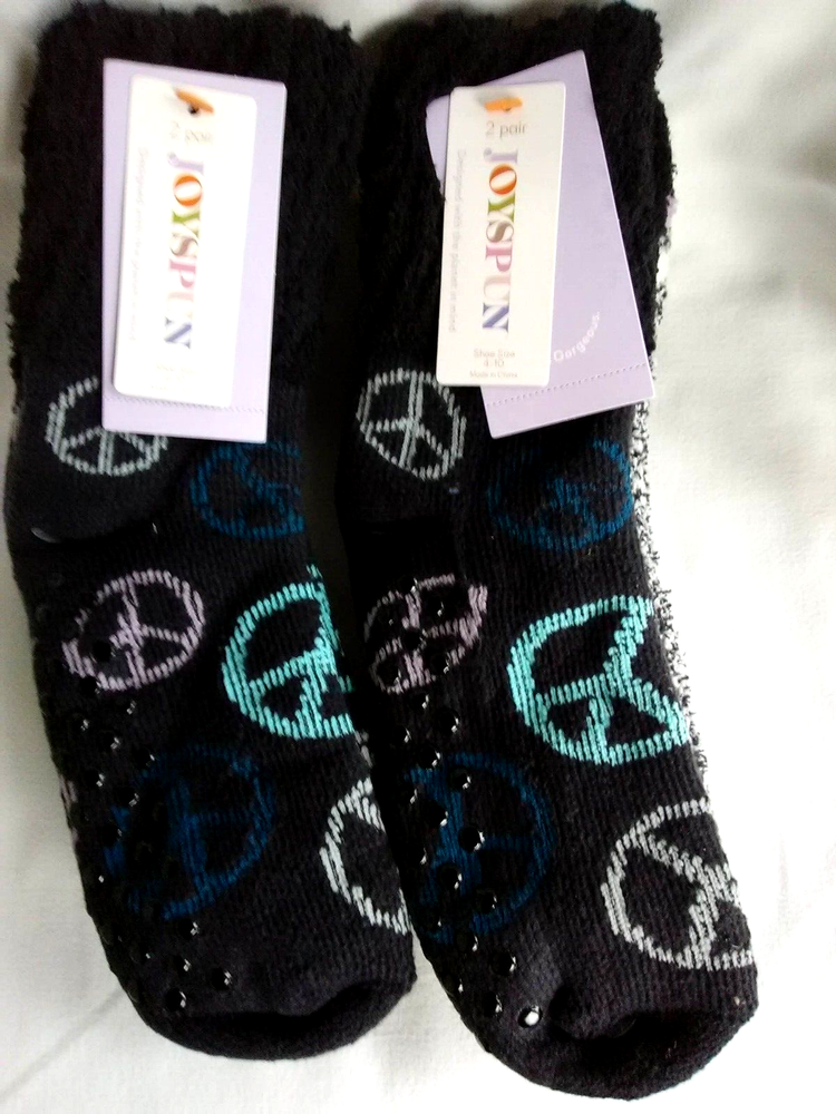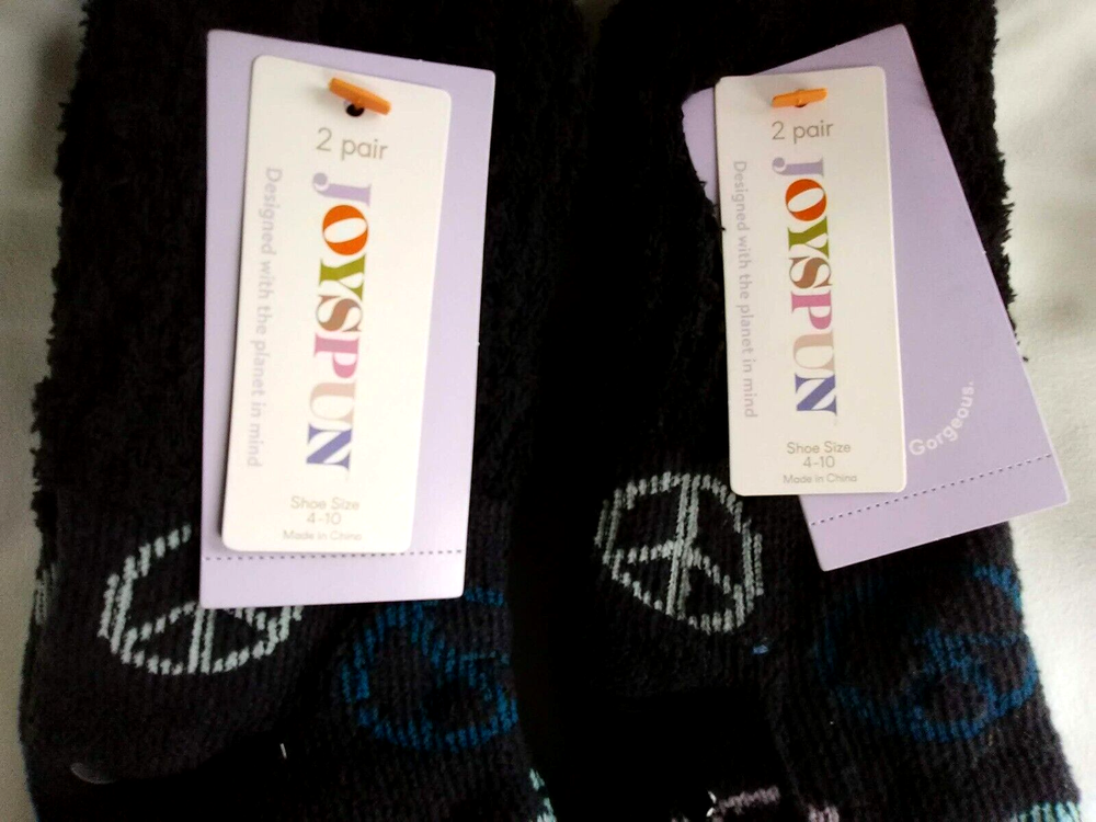 New with tags Joyspun 4 pairs fuzzy with grip socks size 4-10 gray black peace sign print. Luxury lounge socks with grippers.Made with recycled fibers.Polyester spandex blend.