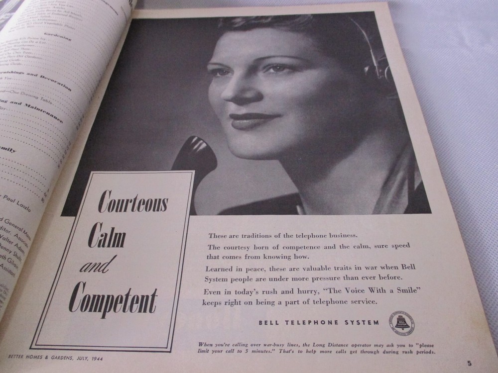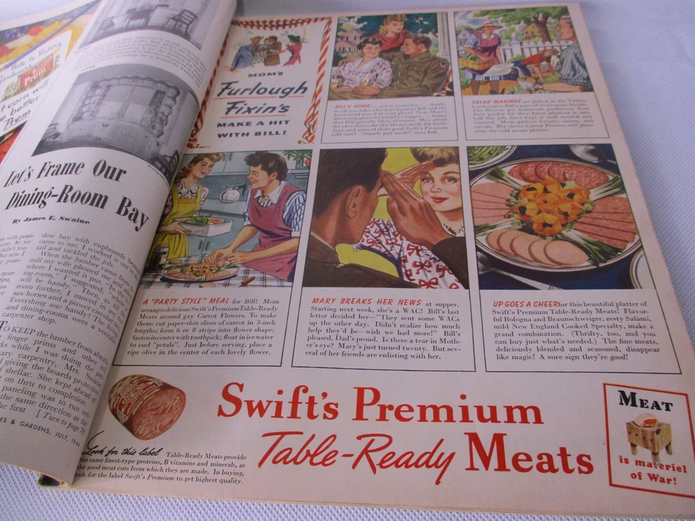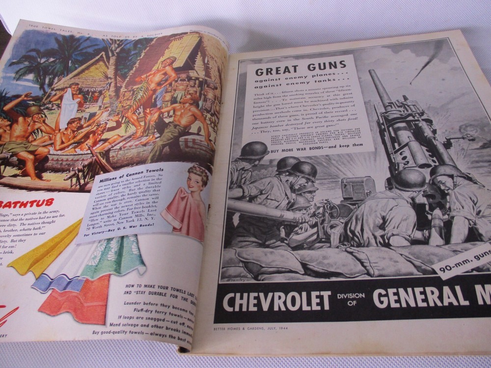 July 1944 WW2 Better Homes & Gardens Magazine Shredd Ralston, Chevrolet, Musaphonic, Swift's Premium Meats Vintage Ads, solid vintage issue, has some wear from reading and storage, dings on the spine and edge dings, spine is solid and pages are tight, good looking magazine for its age. (50746 Hi! And thanks for looking. Hope I can send something good your way. I pack items with care and work my best to get items to you in the best of condition. I have been collecting for over 30 years and do my best to describe everything as well as possible. If I missed something feel free to ask.
