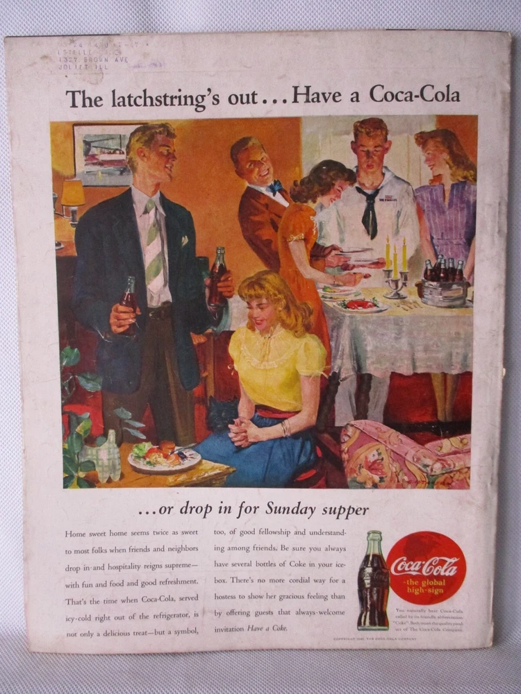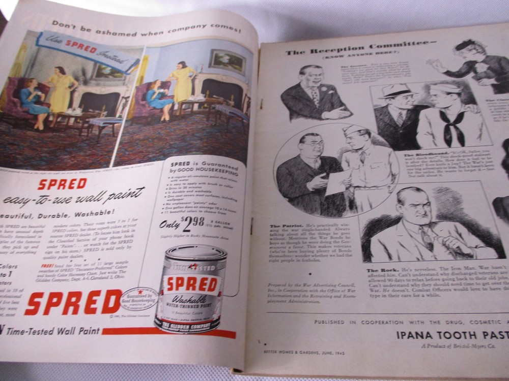 June 1945 WW2 Better Homes & Gardens Magazine Coca Cola, Spred, Ipana, Dutch Boy, Swift's Bacon, Wurlitzer, Vintage Ads, solid vintage issue, has writing on cover, some wear from reading and storage, dings on the spine and edge dings, spine is solid and pages are tight, good looking magazine for its age. (50756 Hi! And thanks for looking. Hope I can send something good your way. I pack items with care and work my best to get items to you in the best of condition. I have been collecting for over 30 years and do my best to describe everything as well as possible. If I missed something feel free to ask.