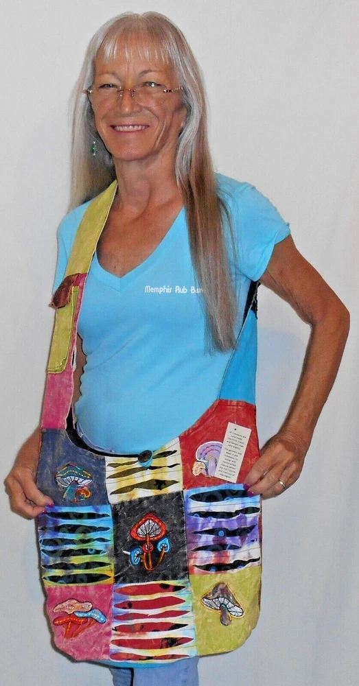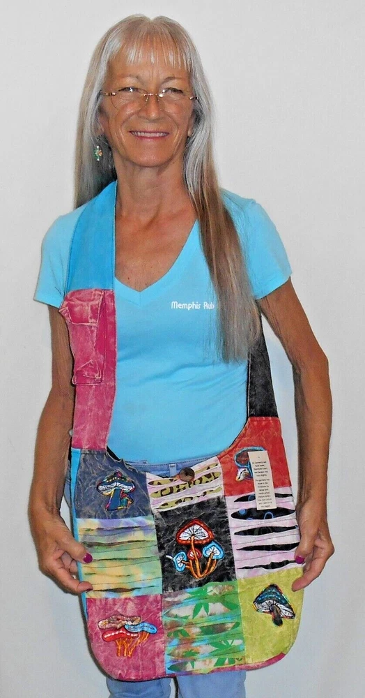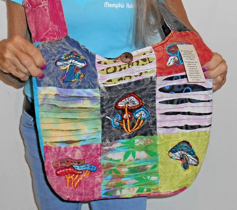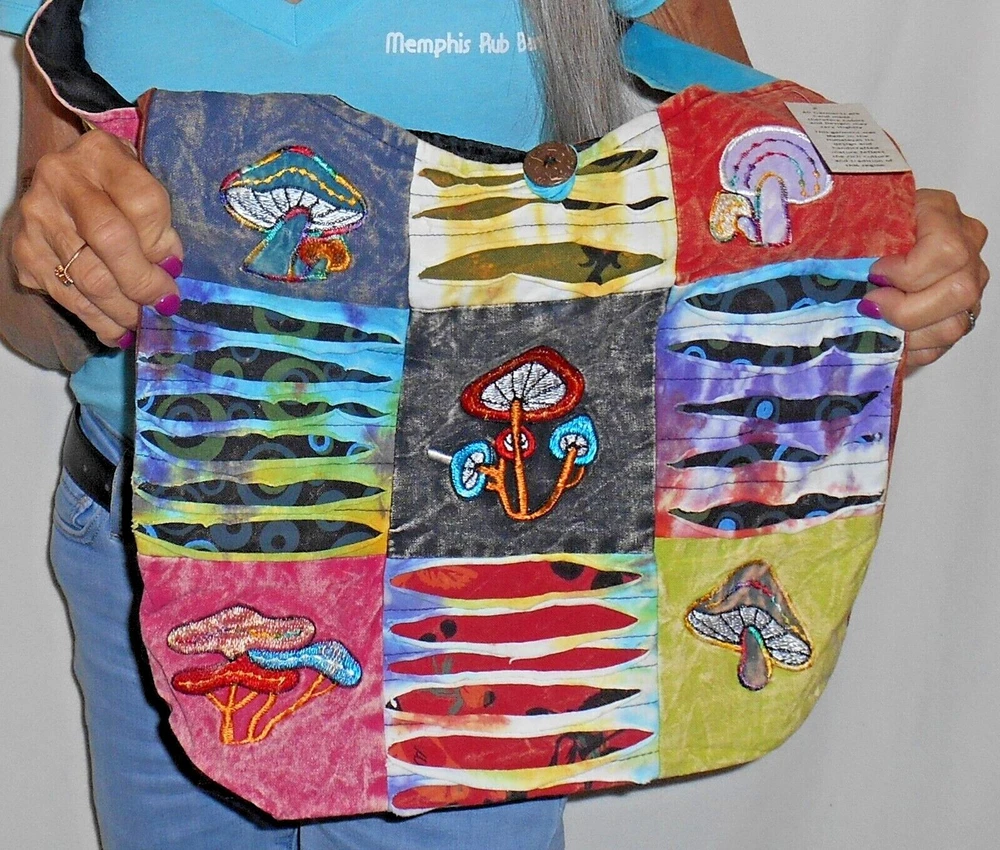 KATHMANDU IMPORTS FAIR TRADE NEPAL WOMEN'S HOBO BAG EMBROIDERED MUSHROOMS MULTI COLOR PATCHWORK CUTTING TECHNIQUE OPENS CLOSES with A ZIPPER & BUTTON VELCRO POCKET on the SHOULDER STRAP ZIPPERED POCKET INSIDE HANDMADE Be Sure to Check ALL Store Departments for a GREAT Selection