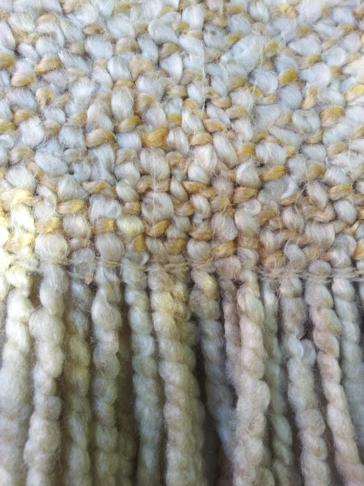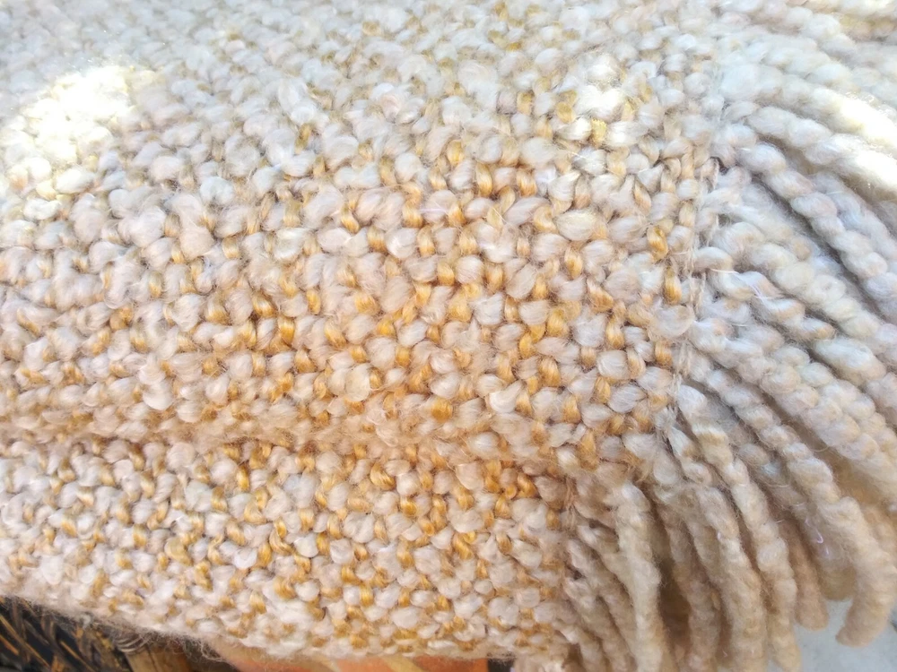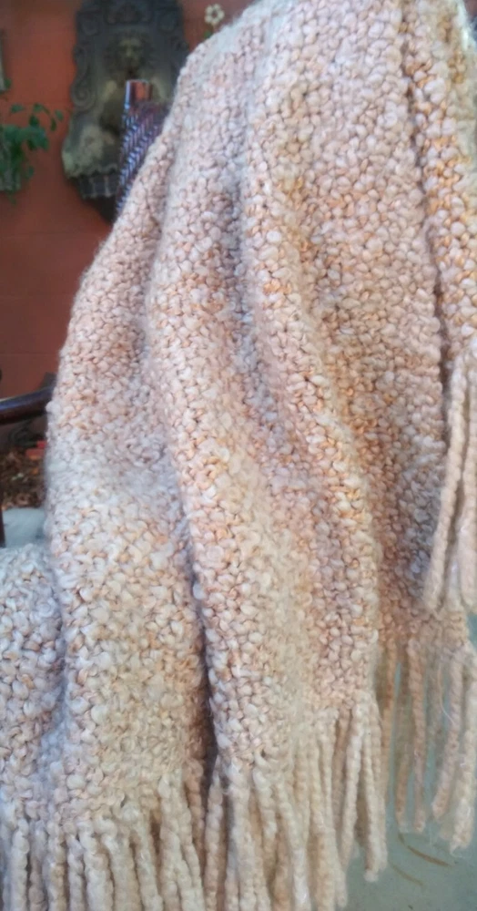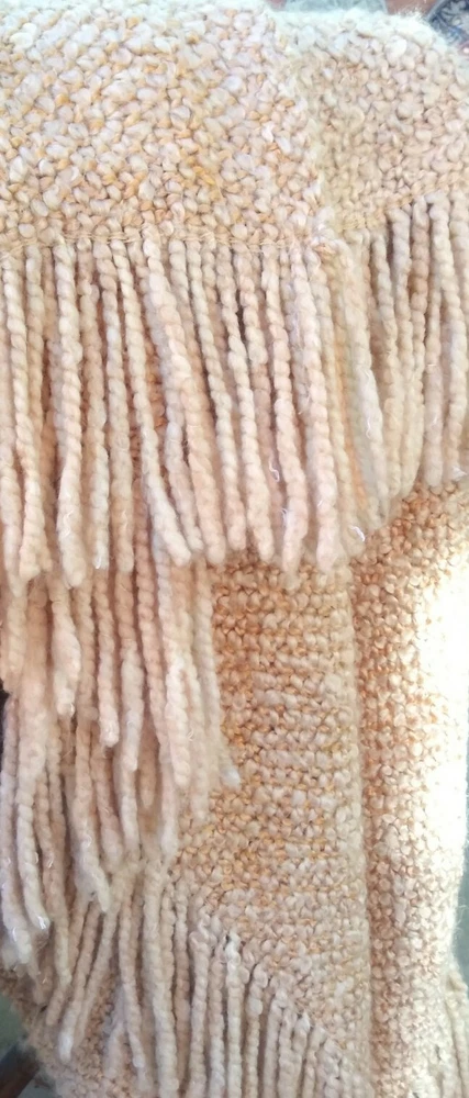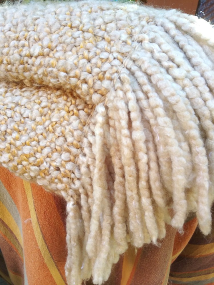 HERE IS A STYLISH THROW BY KENNYBUNK HOME IN CREAM, TAN AND MUSTUARD TONES. WITH A. FLUFFY TEXTURE AND FRINGED ON TWO SIDES. VERY GOOD CONDITION MEASURES APPROX. SIZE 44" x 71" HAND WASH LAY FLAT TO DRY. RETAILED FOR MUCH MORE!