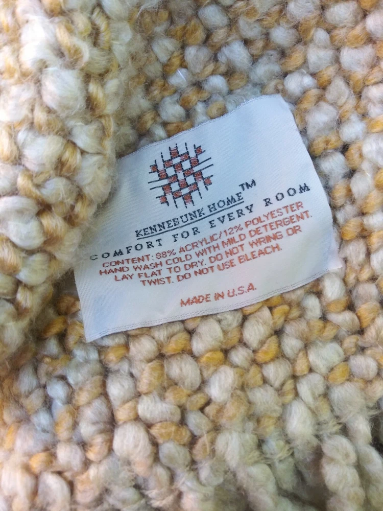 HERE IS A STYLISH THROW BY KENNYBUNK HOME IN CREAM, TAN AND MUSTUARD TONES. WITH A. FLUFFY TEXTURE AND FRINGED ON TWO SIDES. VERY GOOD CONDITION MEASURES APPROX. SIZE 44" x 71" HAND WASH LAY FLAT TO D...