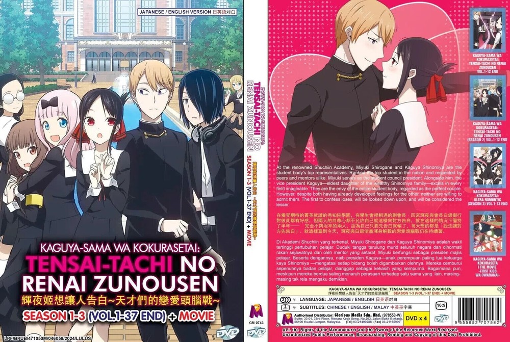 Get a FREE PINBADGE with every purchase DVD Title Name Kaguya-Sama : Love Is War No of Disc 4 Disc (37 Episodes) Version English / Japanese Subtitles Chinese / English / Malay Format DVD / NTSC & All Region Code (16:9) Shipping and Packaging: Thank you for your interest in our product! We are pleased to offer free international shipping for this item. Please note that international delivery typically takes 2-3 weeks. At The Anime Zone, we prioritize the safe delivery of your orders. Our bubble wrapped packages provide excellent protection for fragile items. Each item is meticulously wrapped in multiple layers of high-quality bubble wrap to absorb shocks during shipping. The package is then placed in a sturdy shipping box for added reinforcement. We work with trusted shipping partners experienced in handling delicate packages. You can track your shipment using the provided tracking number. If you encounter any issues, our dedicated customer support team is here to assist you. Trust The Anime Zone for secure and worry-free shipping.