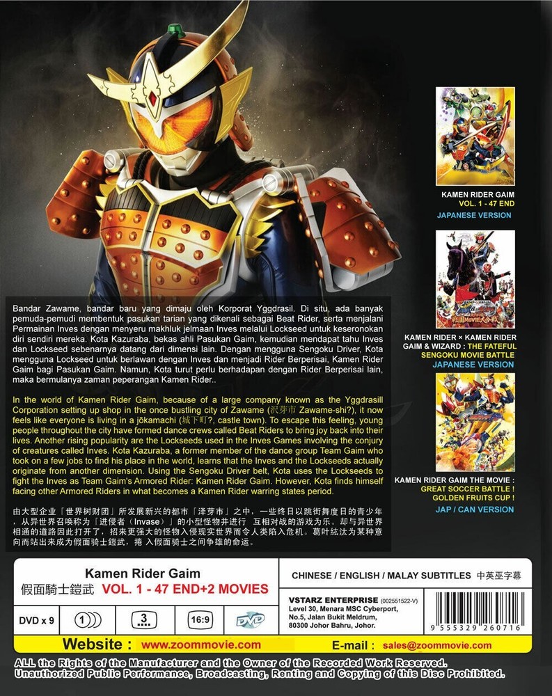 Absolutely thrilled with this Kamen Rider Gaim boxset! The complete series plus movies in crisp quality with English subs is a dream come true. Original licensed DVDs, secure packaging, and great customer service—definitely worth the wait for any fan. Highly recommended!