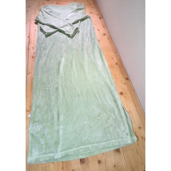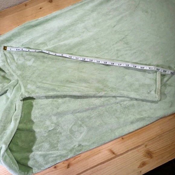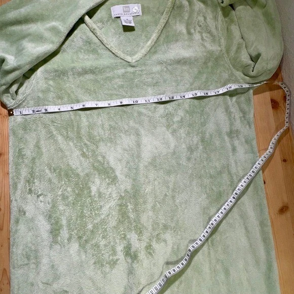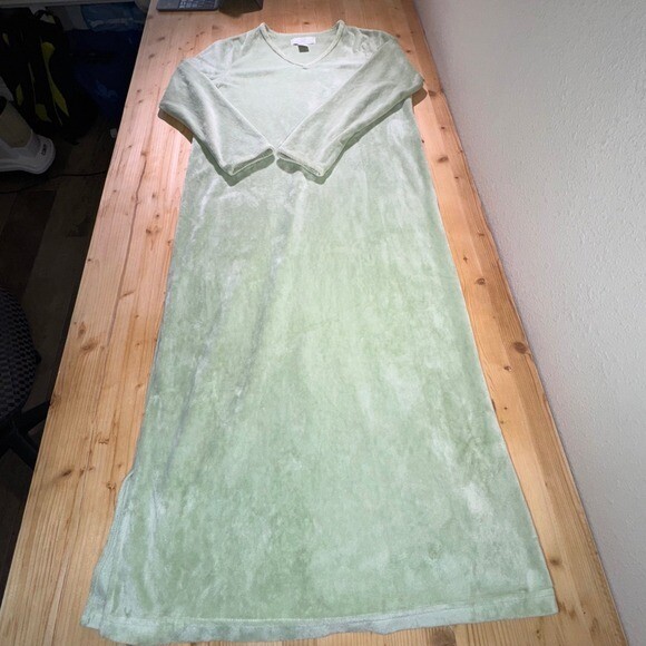 A plush lounge dress from Karen Neuburger, perfect for relaxing in comfort. This dress features a flattering V-neck design and long sleeves, making it ideal for cooler evenings. The soft, plush fabric offers a cozy feel against the skin. It also has side slits at the bottom. Measurements: * Length: 52 inches * Pit to pit: 20 inches * Sleeve length: 23 inches Keywords: Karen Neuburger, lounge dress, plush dress, V-neck dress, long sleeve dress, cozy dress, comfortable dress, green dress, sleepwear, nightgown, loungewear, womens dress, medium dress All items come from a clean, pet free/smoke-free home and are carefully packed for shipping. Send me an offer or Bundle & save.Let's make a deal!