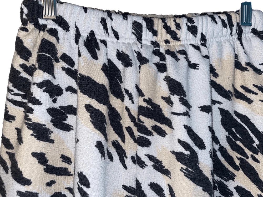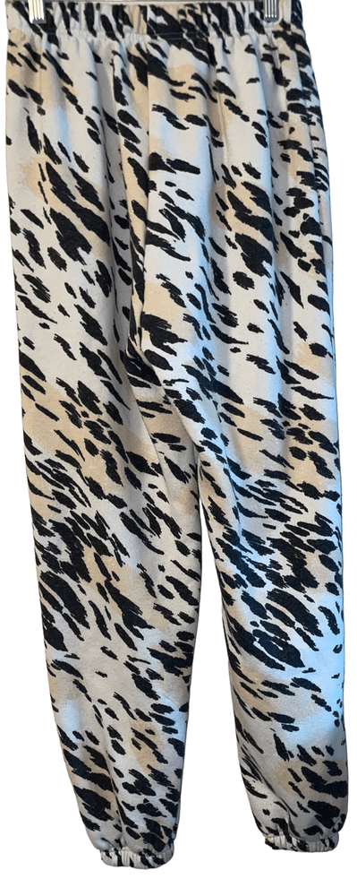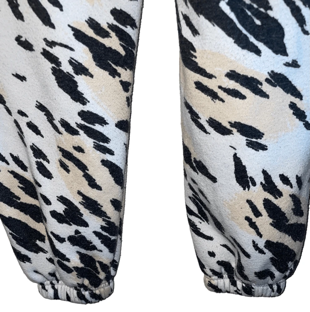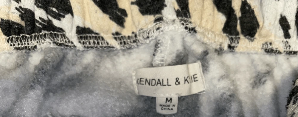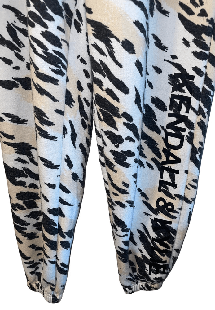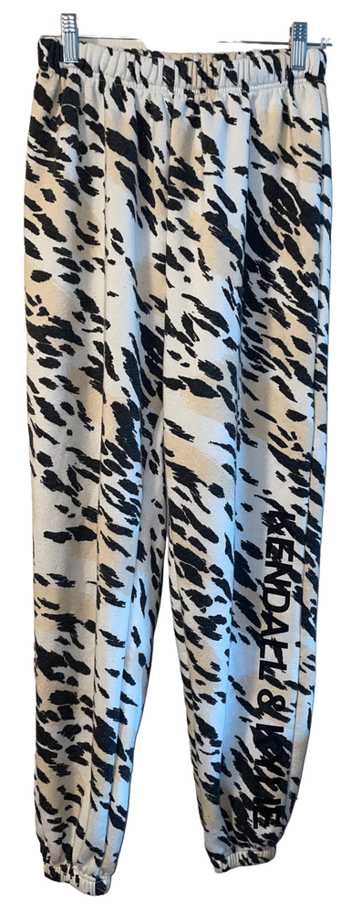 Step up your fashion game with the stylish Cheetah Print with Logo Joggers by Kendall & Kylie! These joggers not only feature an elastic waist with drawstring for the perfect fit but also come with elastic cuffs for a contemporary cool look that is all the rage. The striking cheetah print paired with the brand's logo adds a touch of edge and style to your outfit while keeping you ultra cozy and comfortable all day long. Don't miss out on these trendy joggers that effortlessly blend fashion and comfort in one irresistible package! GUC Minor piling (easy to remove) 60 percent cotton 40 percent Poly Measurements… Waist flat 12” Rise 13” Inseam 27” No pockets