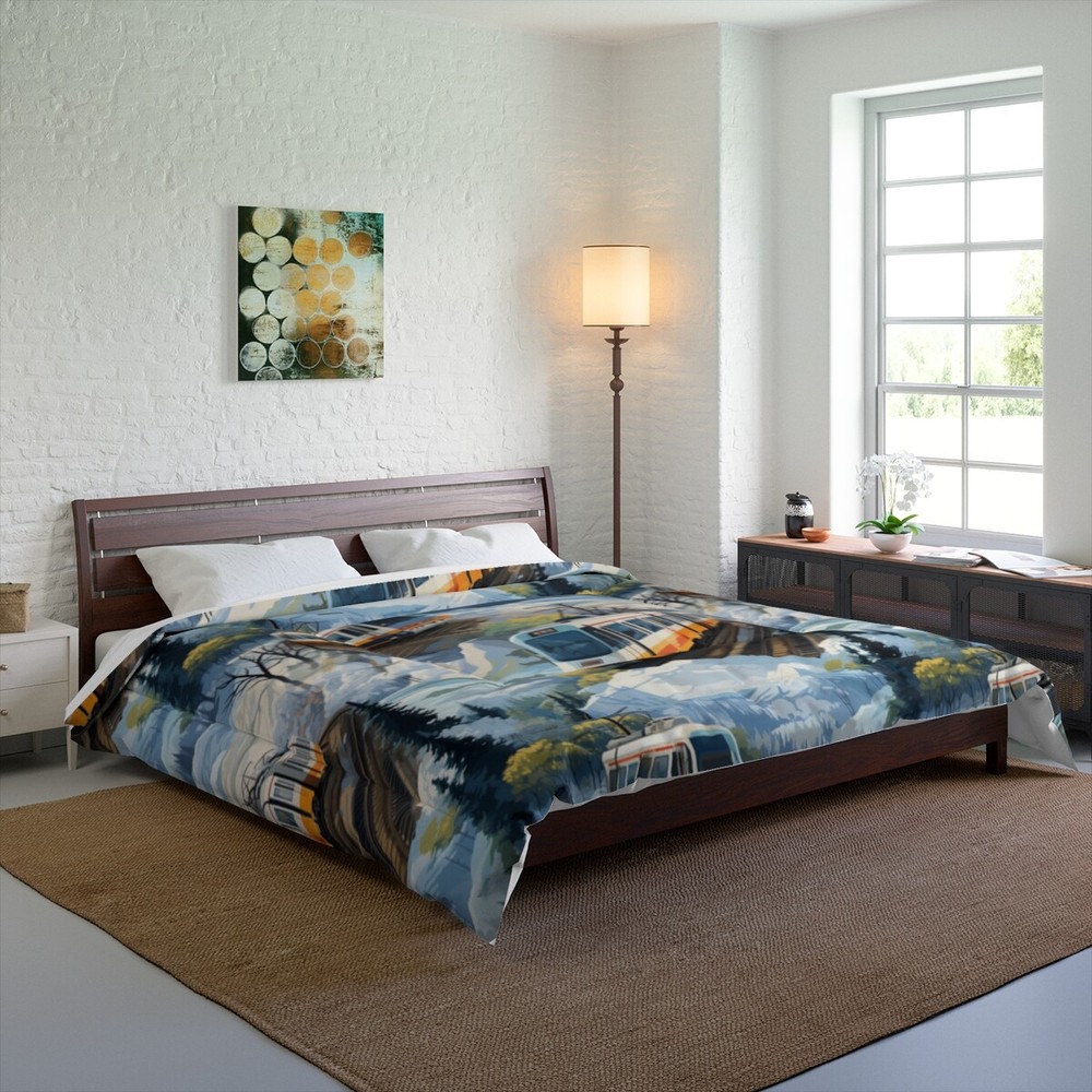 King Size Winter Train Art Comforter with Locomotive Railcar Design for Cozy Home Decor