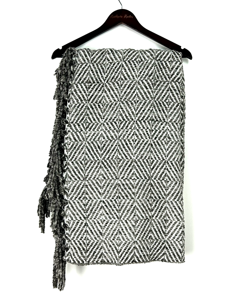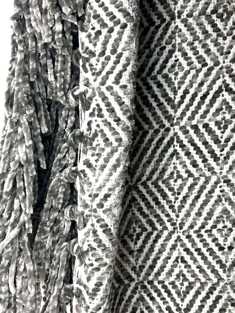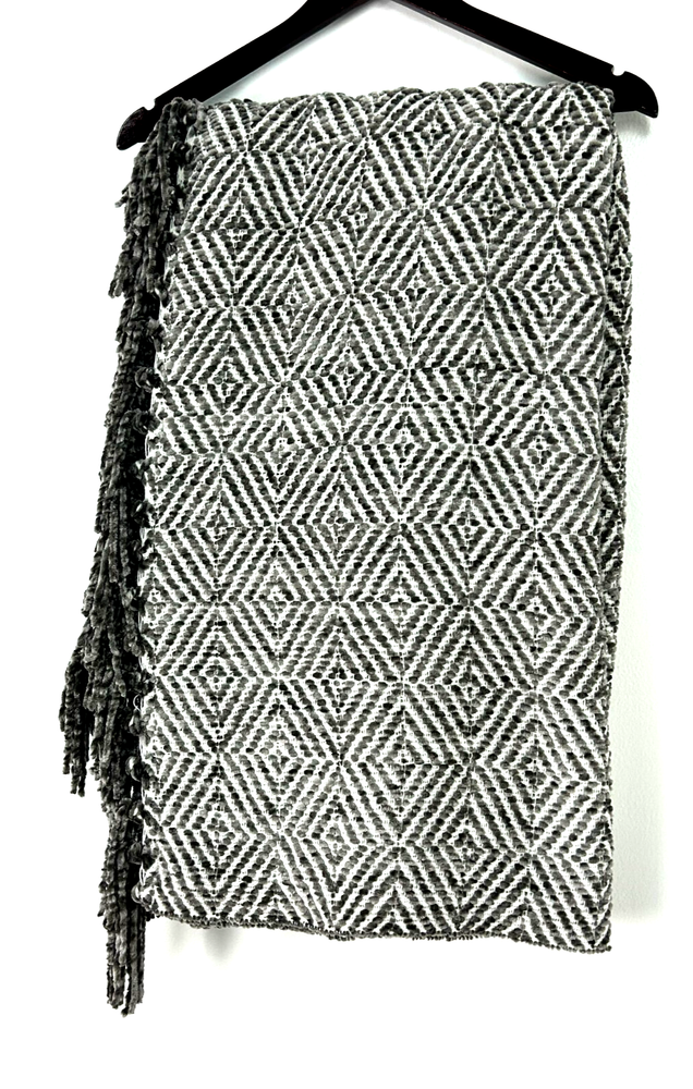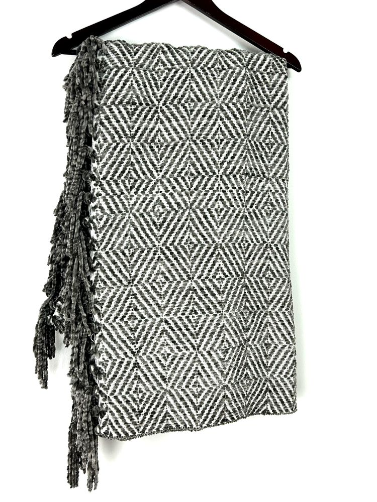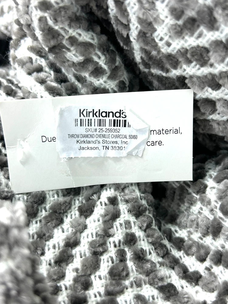 Kirklands Charcoal Gray Chenille Throw Blanket Diamond Fringe Reversible 50x60 Rck Cozy up with the Kirkland's Charcoal Gray Chenille Throw Blanket, a luxurious addition to any space. This modern throw blanket boasts a sophisticated diamond pattern and a versatile charcoal gray hue, making it an easy match for a variety of decors. Crafted from a plush mix of acrylic, chenille, and polyester, it offers warmth and a softness that's sure to complement your comfort routine. Measuring 50 x 60 inches, this reversible blanket features a chic fringe detail, adding a touch of elegance to its cozy charm. Ideal for any room, it's designed for adults and is as functional as it is stylish. For care, simply dry clean to maintain its luxurious feel and appearance. New With Tags!! No stains or flaws. 50"Wx60"L Top Seller!! Fast and reliable shipper. Accepting reasonable offers. Thanks for shopping by. YOU ROCK!! SMOKE FREE HOME
