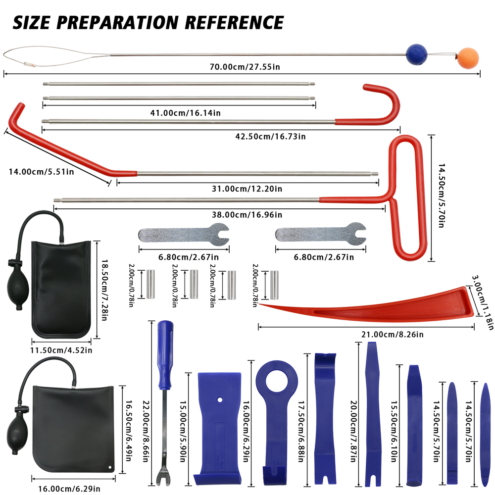 Car Stainless Steel 5th Wheel Pin Puller, 67 Inch Long Reach Tool Outdoor Steel Wheel Puller, Automotive Repair Tool With Carrying Bag (27PCS) Product Description ✅【Flexible and Convenient Design】Long Reach Tool segmented design for easy disassembly, Multi-angle hook design can pull and move objects easier. Such as rolling garage doors,carts, crates and other stacks. ✅【Multi-Purpose Use】Our car tool kit can adjust the decorative strips, Air-conditioning outlets, Audio dashboards, And loose screws in the car. Choosing the right tool can make your work easier more efficient. ✅【Premium Material】Made of High quality ABS plastic and stainless steel, Strong structure, Anti-oxidation, Not easy to bend. They are reliable for emergencies, For a long lifetime use and easy to keep clean. Why do you choose our Car Repair Tool Kit? ✔️Our car tool kit can Adjust the decorative strips,air-conditioning outlets,audio dashboards,and loose screws in the car. Choosing the right tool can make your work easier more efficient.. Made of High quality ABS plastic and stainless steel,Strong structure,Anti-oxidation,Not easy to bend.They are reliable for emergencies,For a long lifetime use and easy to keep clean. ✔️We always put the customer's satisfaction firstly, try our best to solve customer's any problem. ✔️If you have ordered a wrong item or not satisfied with our product .Please let us know firstly by sending message or e-mail.We will reply to you within 24 hours and offer you our best services. ✅【Easy to Carry】Our car tool kit is equipped with a portable carrying bag. Packaging Include: 1 x Portable carrying bag 2 x Stainless steel straight rod 3 x Wrapped environmental protection non-slip protective sleeve stainless steel hook 2 x Non-slip handle wrench 4 x Hexagonal nuts 9 x Car decoration warping plate removal tools 2 x TPU material can be compressed expansion air bag 1 x Heavy Duty Long Reach Grabber Tool 2 x Non-slip gloves 1 x Towel