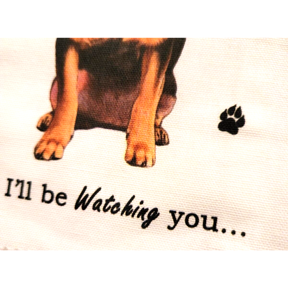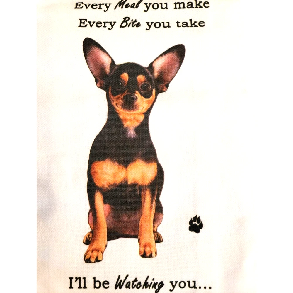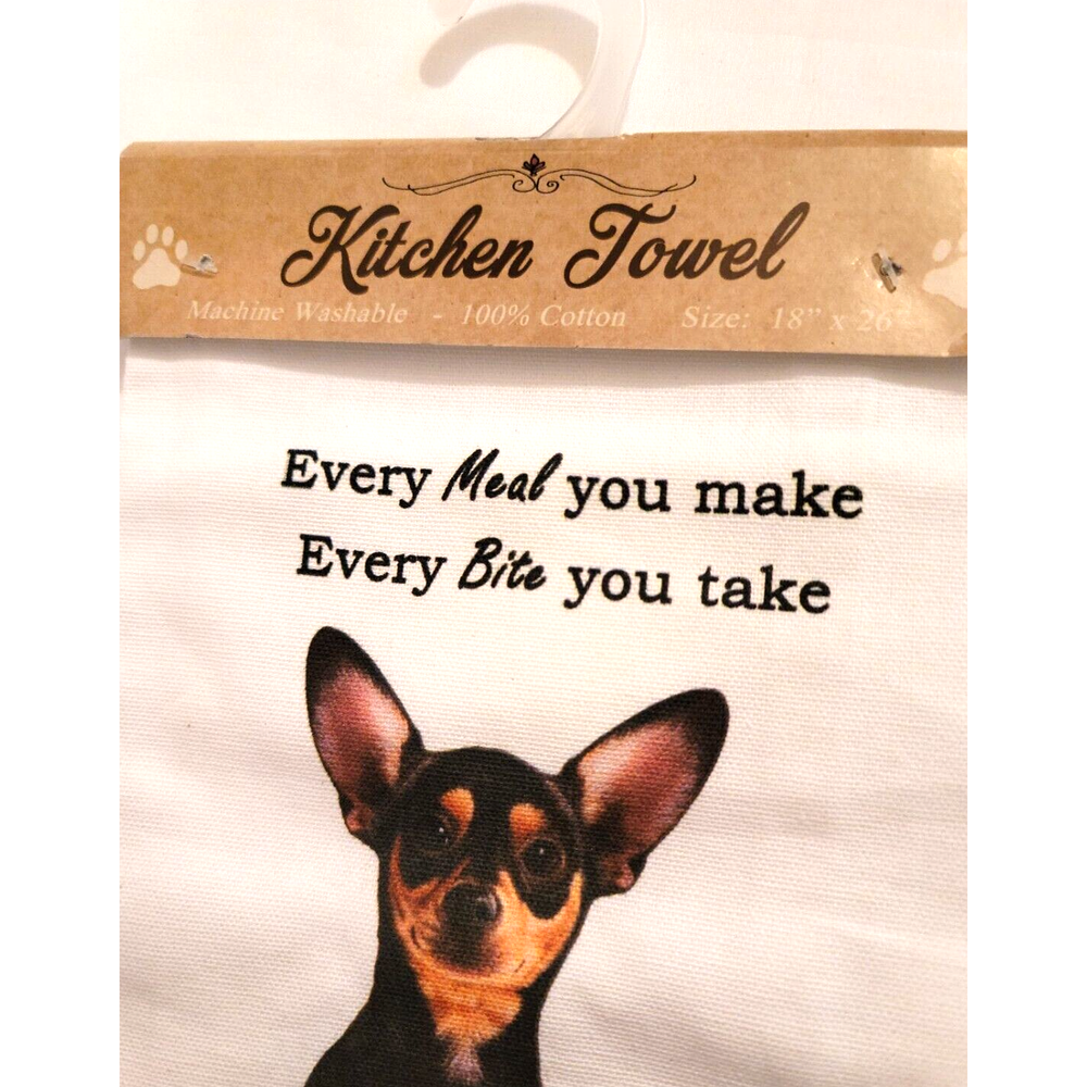 <![CDATA[<div>This is a very cute kitchen tea towel with a humorous saying. It has a very sweet picture of a black chihuahua giving a stern warning to his owners. The towel is 18in x 26 in. and is 100 % cotton. It is of course machine washable.