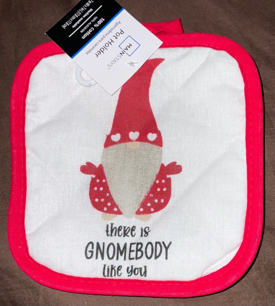 Set of 3 Kitchen Tea Towels Pastel Hearts LOVE There is Gnomebody Like You Red Heart on Black Stripes 15” x 25” each Cotton Bonus Gnome Pot Holder By Mainstays New with tags .25x3...