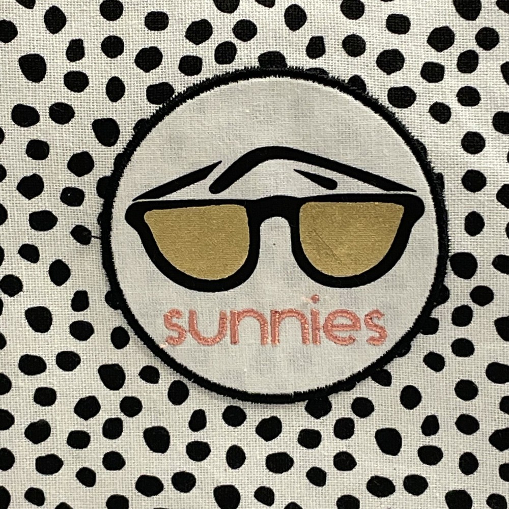 Design Imports Embellished Kitchen Towel featuring "Sunnies" with a pair of sunglasses on white material with black spots. Towel is brand new with tag attached.