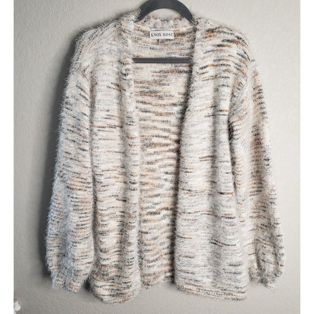Knox Rose Fuzzy Woman's cardigan Size S Cozy Comfort Bishop Sleeves Measurements while laying flat Length 27.5" Hem 19" Chest 20" Sleeve 23"...