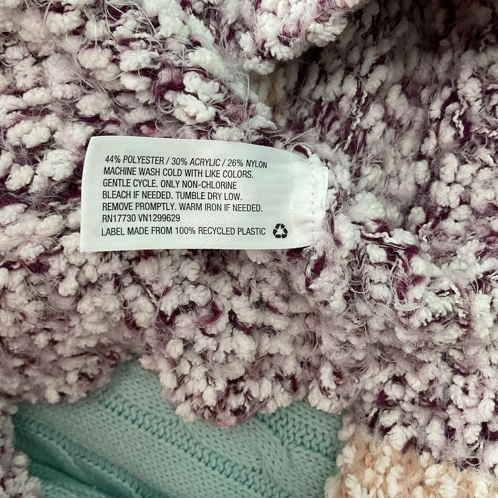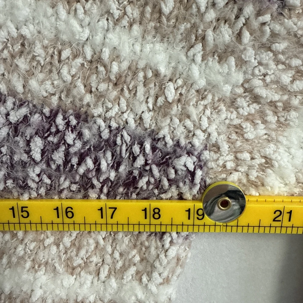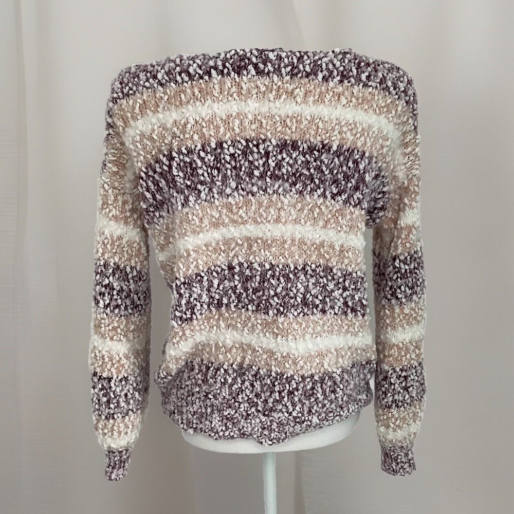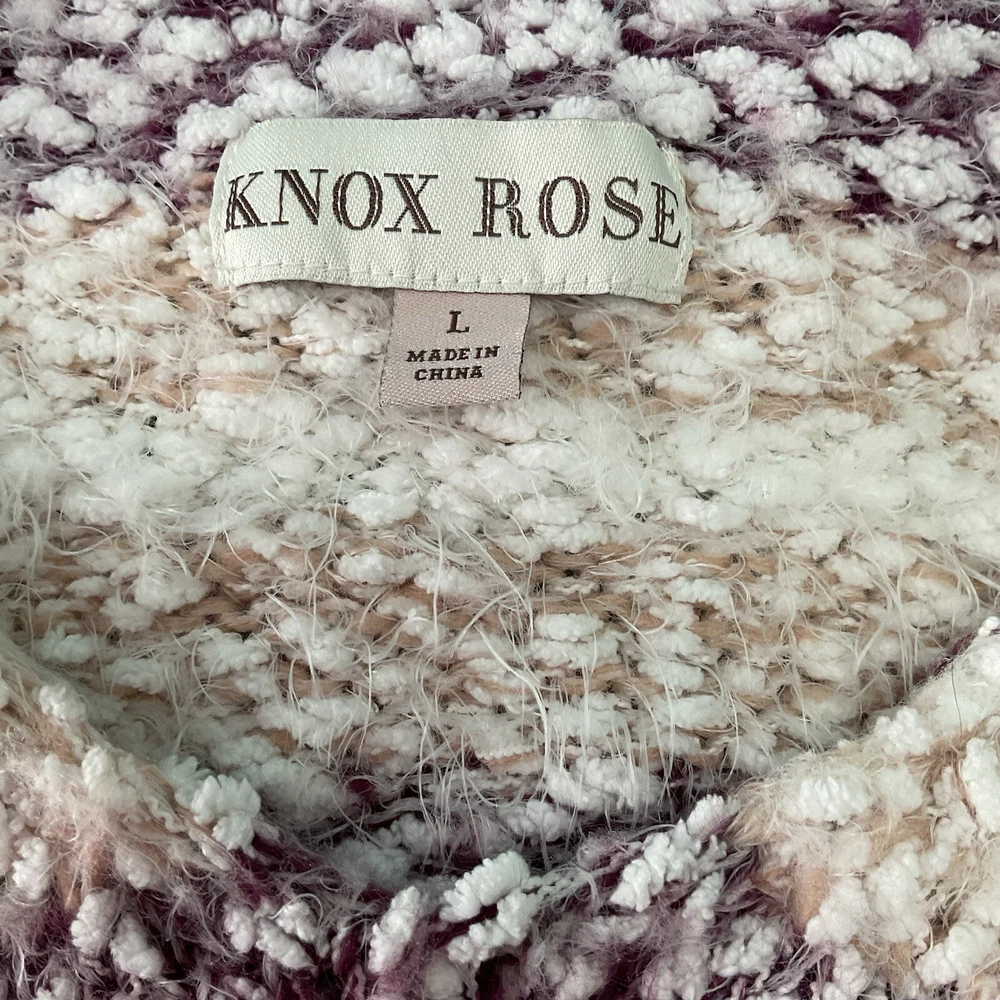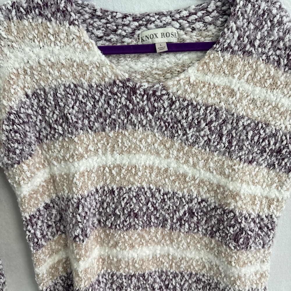 This Knox Rose sweater is a cozy and soft women's pullover in a chunky-knit style with a V-neckline. Featuring a multicolor striped pattern with a rose design, it is made of a super soft acrylic blend material. The sweater has long sleeves, a relaxed fit, and is collarless with dropped shoulders, making it perfect for the winter, fall, and spring seasons.