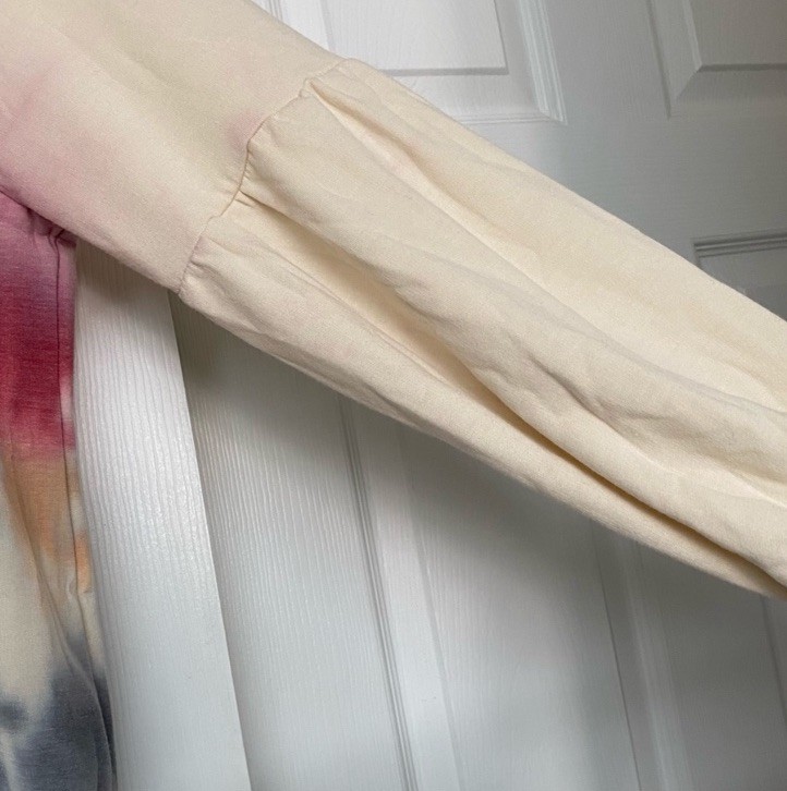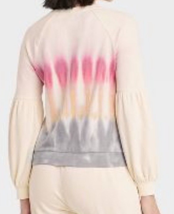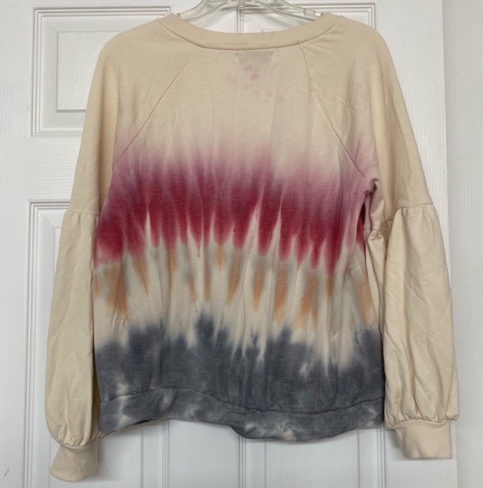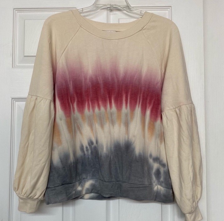 Super soft fleece lined sweatshirt with bishop sleeves. Pretty colors! 62% Polyester, 34% rayon, 4% spandex. Armpit to armpit measures approximately 21”. Great gently used condition.