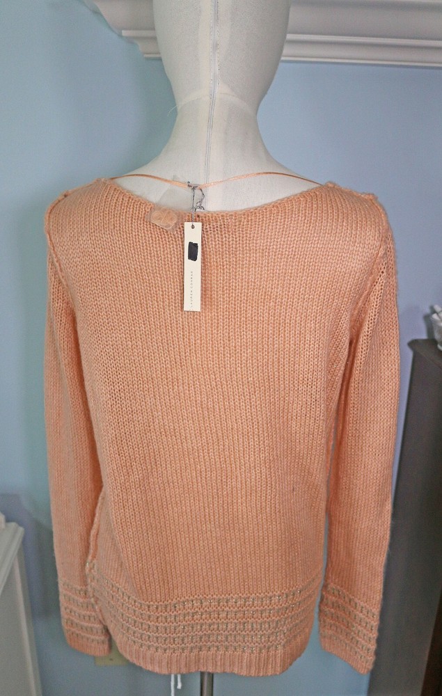 This auction is for a super soft and snuggly pull over sweater by Lauren Conrad. It is a peachy pink color with silver threaded accents along the bottom of the sweater as well as along the bottom of the sleeves. Brand new with tags. Size medium. Measurements laying flat across chest 21 inches and length 27 inches.
