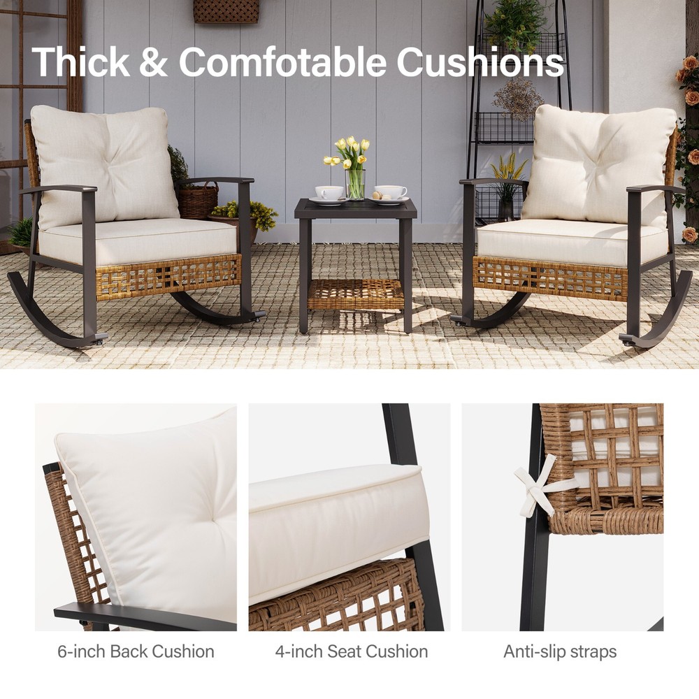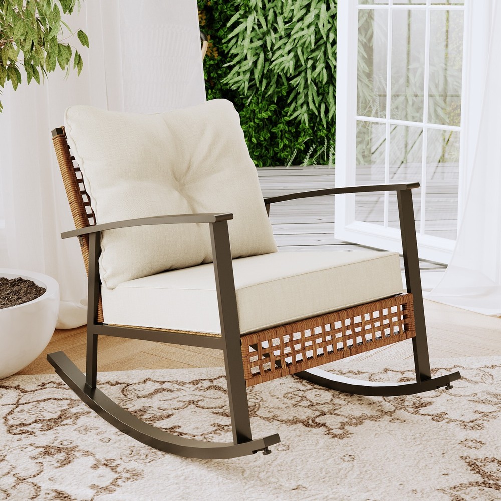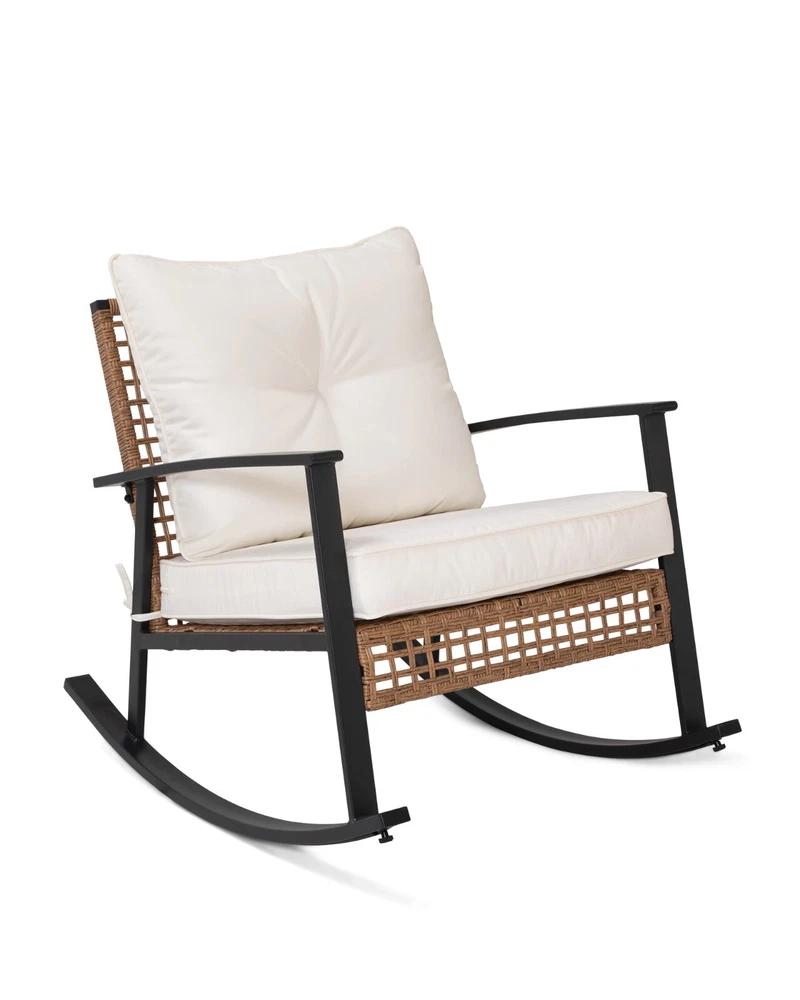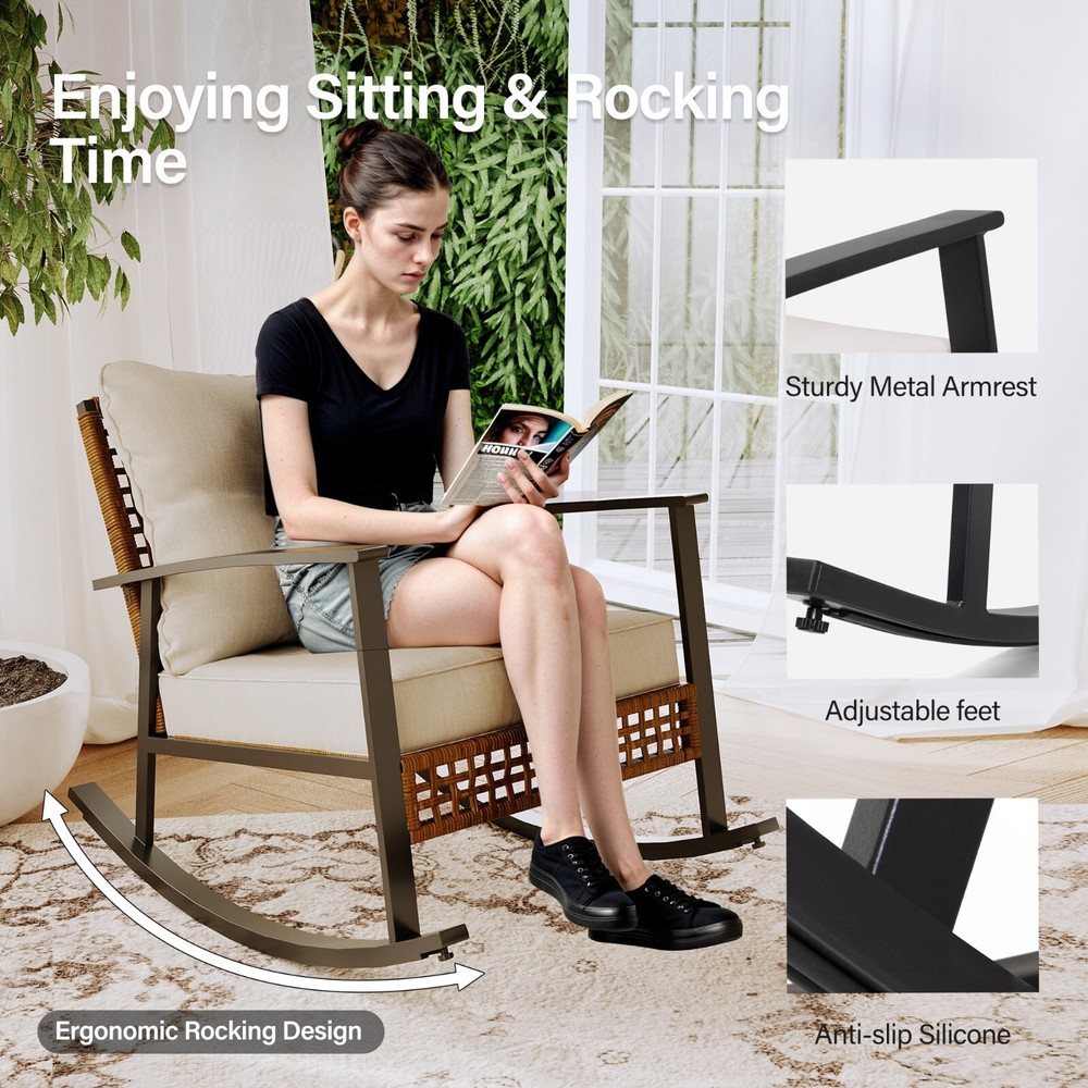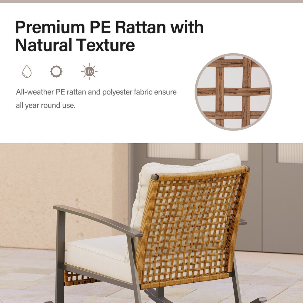 Sturdy & Durable Frame - Constructed with a robust steel frame, this healing chic patio rocking chair ensures worry-free use all year round. Its ample size and wide armrest guarantee an outstanding outdoor sitting and rocking experience. Ergonomic Rocking Design - Designed for front and back rocking, this patio rattan chair can hold up to 300 pounds. Featuring anti-slip silicone elements and adjustable feet, it offers stability and safety while relaxing your body. Soft & Comfortable Cushions - The seat and back cushions of this outdoor rocking chair have been upgraded to 4 inches and 6 inches in thickness for superior comfort. Their waterproof and fade-resistant polyester cushion covers ensure durability and easy maintenance. Premium PE Rattan - Crafted by handwoven PE rattan with a sleek and modern hollow appearance, this cute outdoor rocking chair can match any outdoor decor style, ideal for enjoying your spare time in your patio, garden, and backyard. Easy Assembly - An adult can finish all the assembly in 30 minutes with a clear manual that comes with the box.