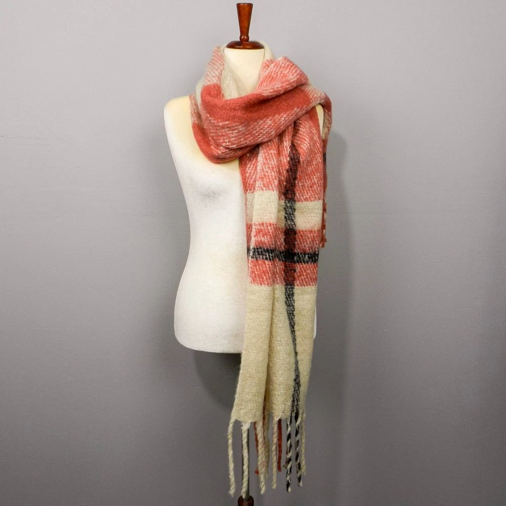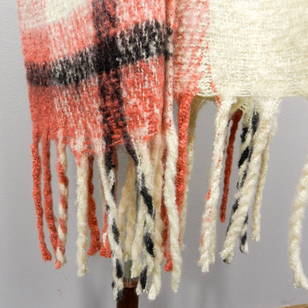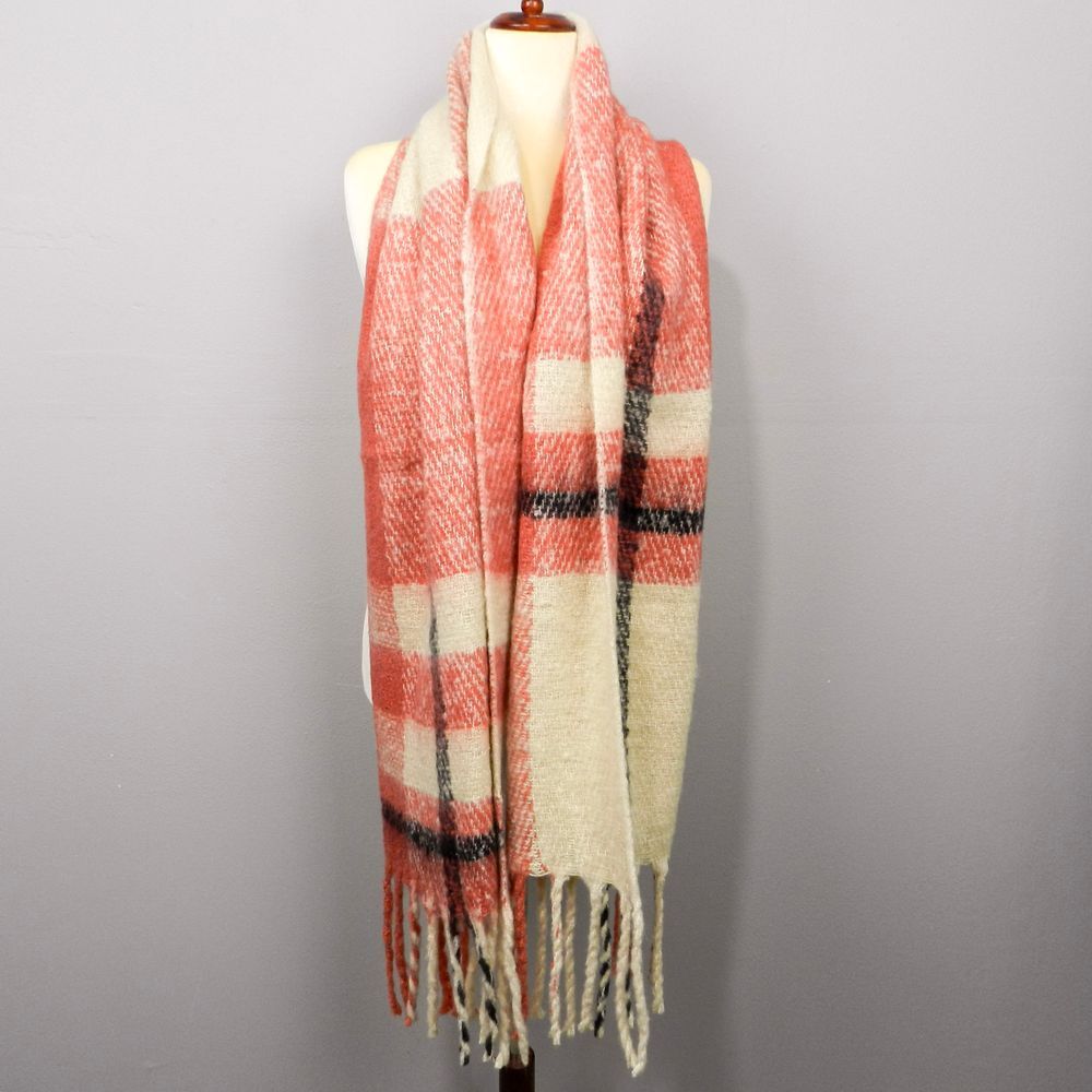 Beautiful plaid scarf in coral pink and ivory cream with charcoal accents. Features a soft woven texture and trendy fringe trim. Perfect for adding a cozy layer to fall/winter outfits. Great for casual outings, office wear, or weekend brunches. In excellent condition. Condition: Used - Excellent - No Flaws Approx 76" x 18.5" Measured Flat Department: Women Type: Shawl/Wrap Material: Polyester, Acrylic Style: Blanket Scarf Pattern: Plaid Season: Fall, Winter Accents: Fringe Country/Region of Manufacture: China • Fast Shipping! within two business days. • All items come from a dog-friendly, smoke-free home. • Please compare the measurements to something you already own to compare fit. Keywords: boho, classic, fall, preppy, cottagecore, romantic, light academia plaid scarf, fringe scarf, winter accessories, coral scarf, blanket scarf, cozy scarf, LC Lauren Conrad scarf, plaid wrap, winter wrap, coral plaid