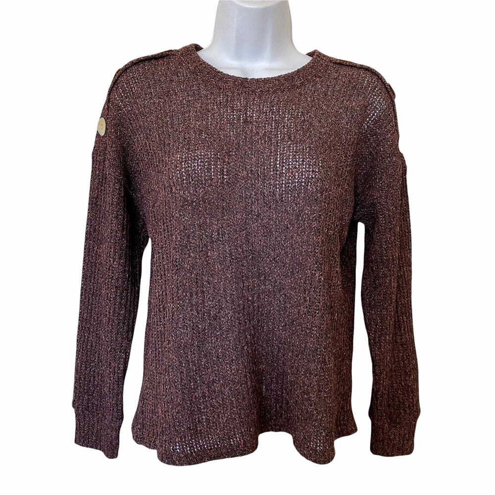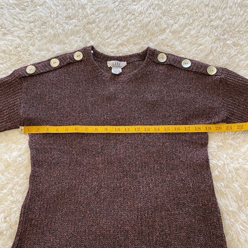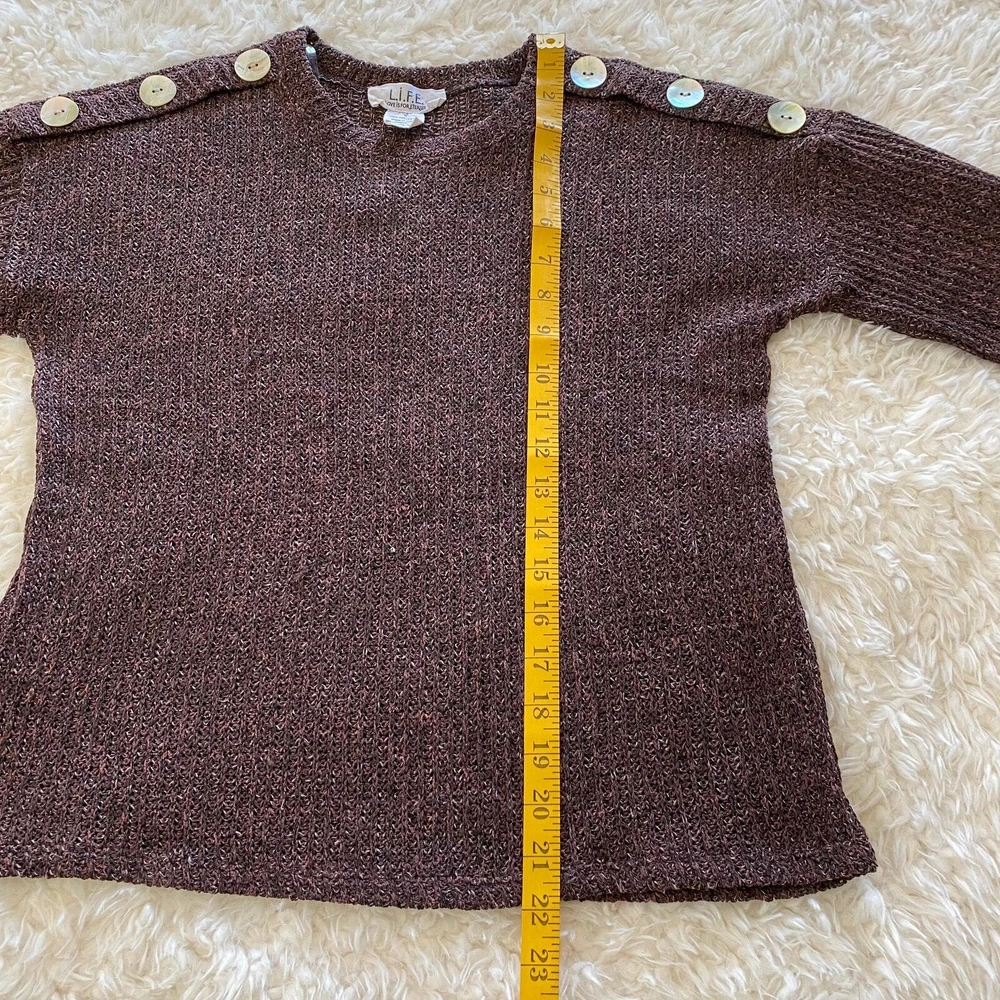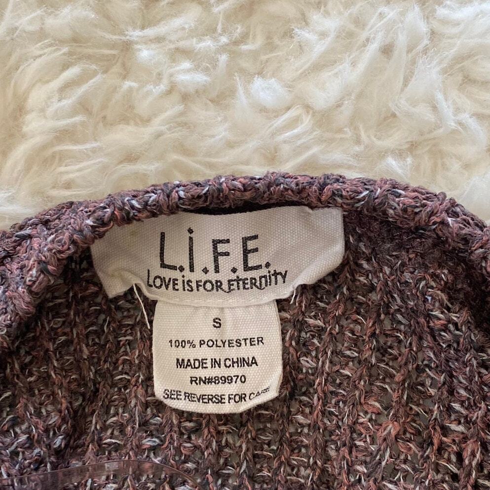 <![CDATA[<div>Love is for Eternity (L.I.F.E.) Lightweight Long Sleeve Sweater. Size Small. Plum, grey & brown. Very pretty. • Crew neck • Pullover • Lightweight • Button detail at shoulders • Excellent pre-owned condition. • Two very small, barely noticeable snags on front (see last 2 pictures). 100% Polyester. Hand Wash. Armpit to Armpit: 19.5" Length: 22" Measurements are approximate. See measurements in photos for reference. -------- From a smoke-free home. Next business day shipping.