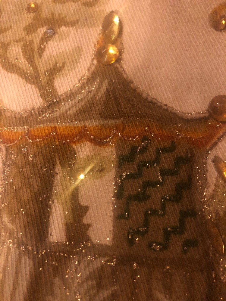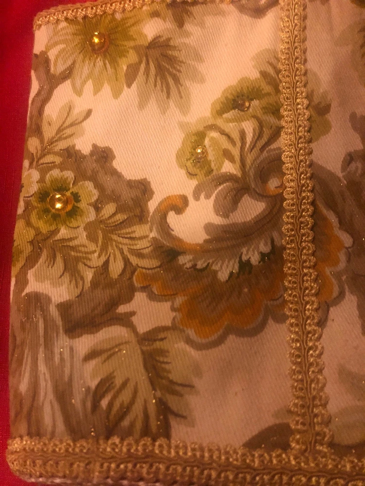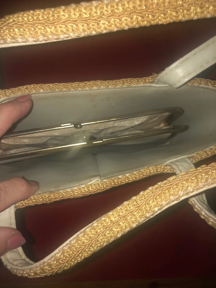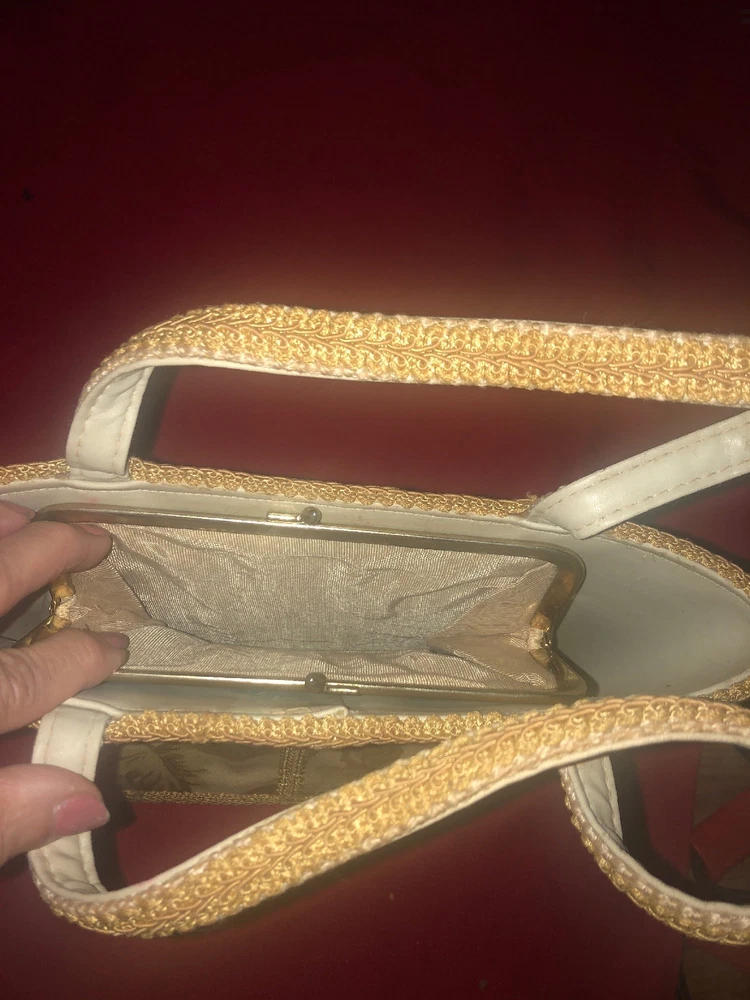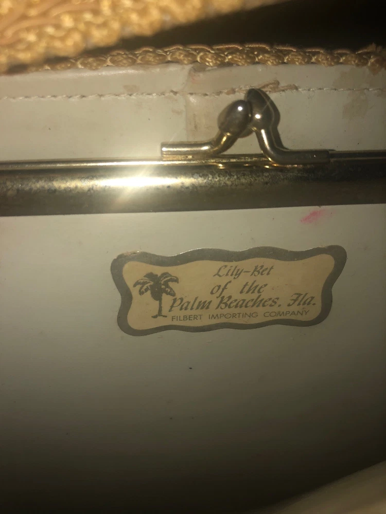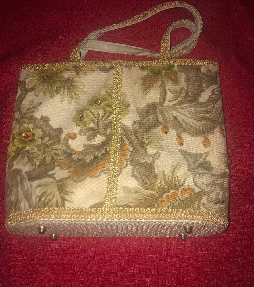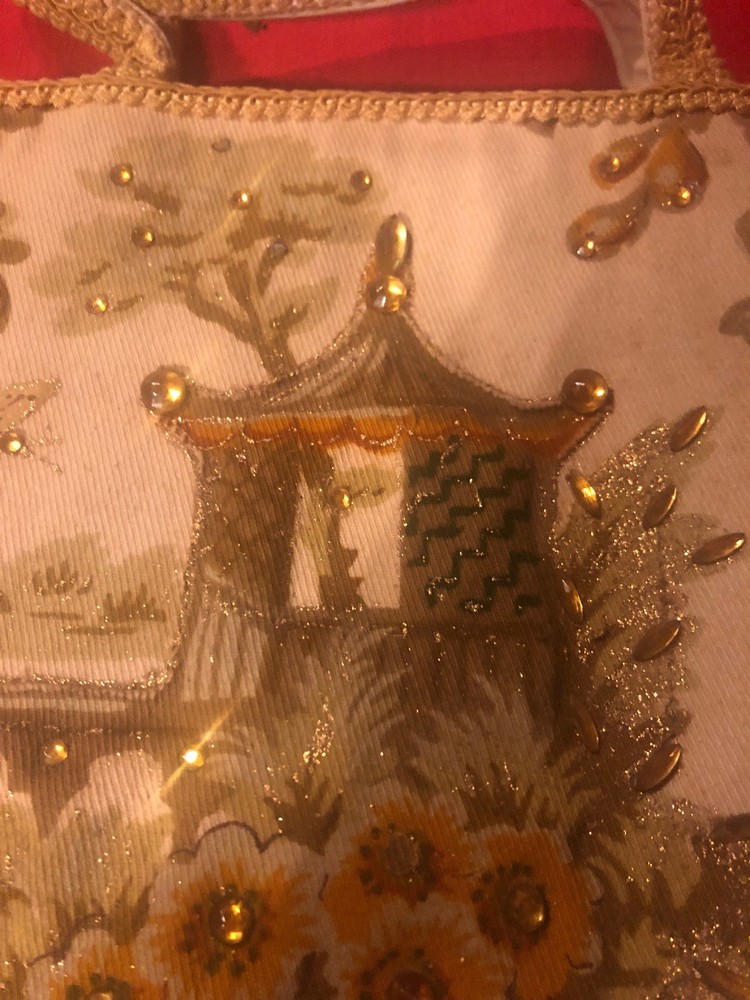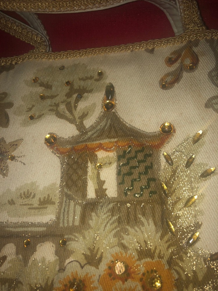 Vintage 50's 60's LILY-BET Design Filbert Imports Of The Palm Beaches Tote Purse Multi-Color Exterior With o range yellowish Rhinestone Accents & Beige Braid Trim On An Oriental Asian pagoda Theme, Vinyl Interior With Center Pocket & Gold Tone Frame & Clasp . 4 brass feet on bottom. Condition: Very Good Vintage Condition, minor small spots from normal use, but barely visible. Measurements: Width: 10 3/4" Height: 9 3/4" (no handle), 15 3/4" (with handle) Depth: 3 1/2"
