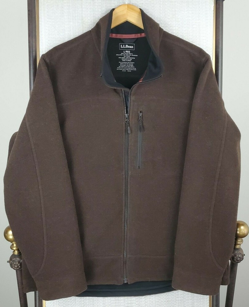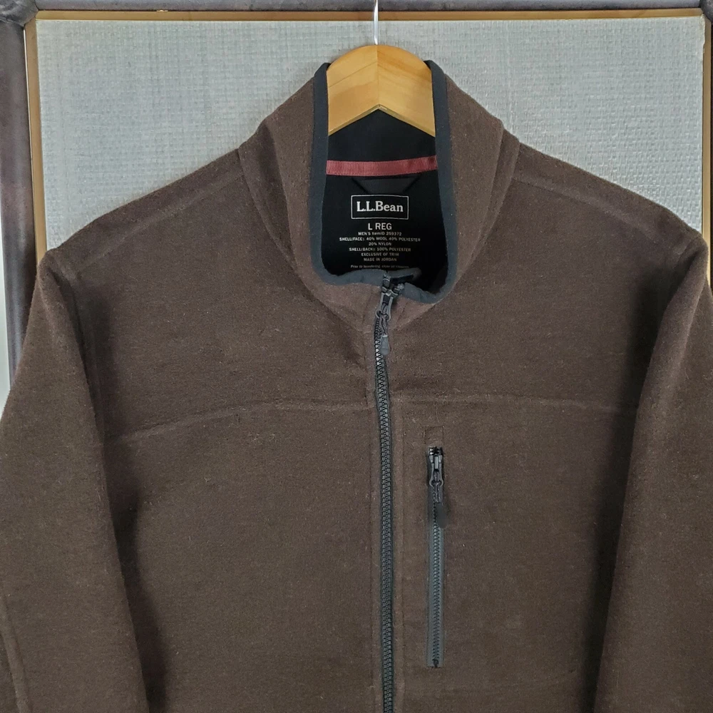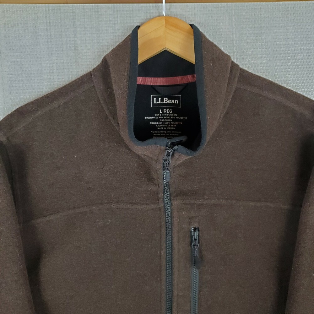 L.L. Bean Men's Hardfaced Wool Blend Full Zip Jacket Features: Full Zip-Zip Hand Pockets-Zip Chest Pocket-Water Resistant-Wind Resistant-Breathable-Moisture Wicking-L.L. Bean Hem Logo Material: Shell: 40% Wool / 40% Polyester / 20% Nylon Lining: 100% Polyester Size: Large Color: Brown Chest(armpit to armpit): 25" Length: 31" Condition: excellent condition- no rips, stains, tears, holes Shipping: USPS Priority Mail - Delivered in 1-3 Days Fast Same Day Shipping Returns Accepted-100% Satisfaction Guaranteed. Thanks Track Page Views With Auctiva's FREE Counter
