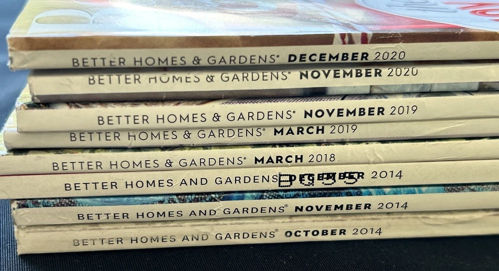 This lot includes 8 issues of Better Homes & Gardens magazines covering a variety of topics such as cooking, decorating, and antiques. The publications range from October 2014 -2020. These issues are in very good preowned condition.
