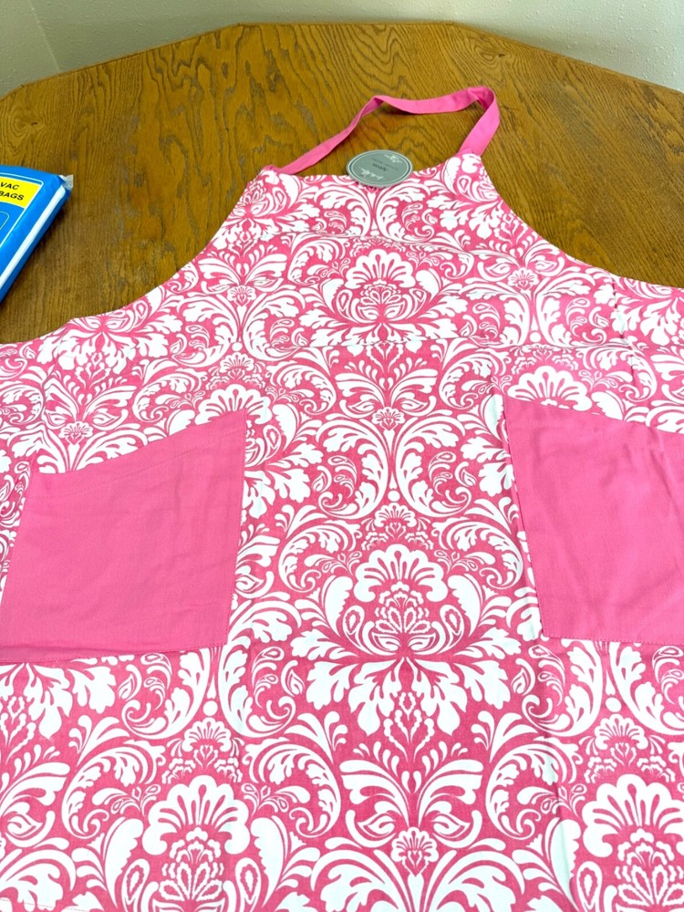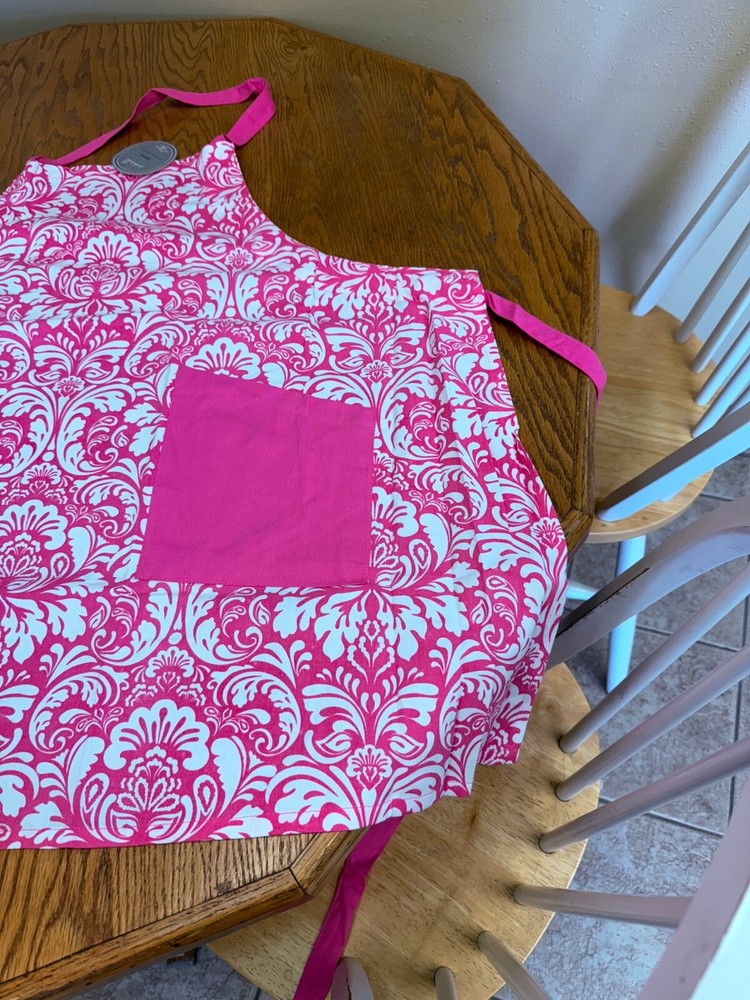 Lot of 2 aprons still in packaging. I had to open one of the pkgs to take the pictures. Each apron measures 29" x 37.5". It was hard to capture the color of the apron with my camera. The pink on the body of the apron is a medium pink with white flowers, and the pockets and ties are bright, pink or hot pink. The colors are somewhere between the bright pictures and the lighter one.