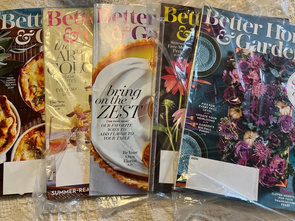This product is a lot of 5 Better Homes and Gardens magazines from 2018 to 2021. The magazines are published monthly by Meredith and feature topics such as photography, recipes, plants, and food. The contributors are various and the magazines are in English. The issues include the months of March, April, and November and have a focus on design, cooking, and art.