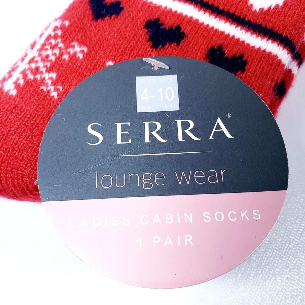 Stay cozy and comfortable during the colder months with these adorable Serra Lounge Wear Ladies Red Cabin Socks. The socks feature a charming Hearts & Snowflakes pattern with a vibrant red color that is perfect for casual occasions. These socks are made from a soft and durable Polyester Blend and Cotton material, ensuring a comfortable fit every time. These Crew Socks have a full toe style and a mid-calf length, perfect for lounging around the house or running errands. They are machine washable for easy care and maintenance, and are cushioned with thermal features to keep your feet warm on those chilly days. These socks are a must-have for any winter wardrobe and would make a great gift for anyone who loves Hearts and the winter season.