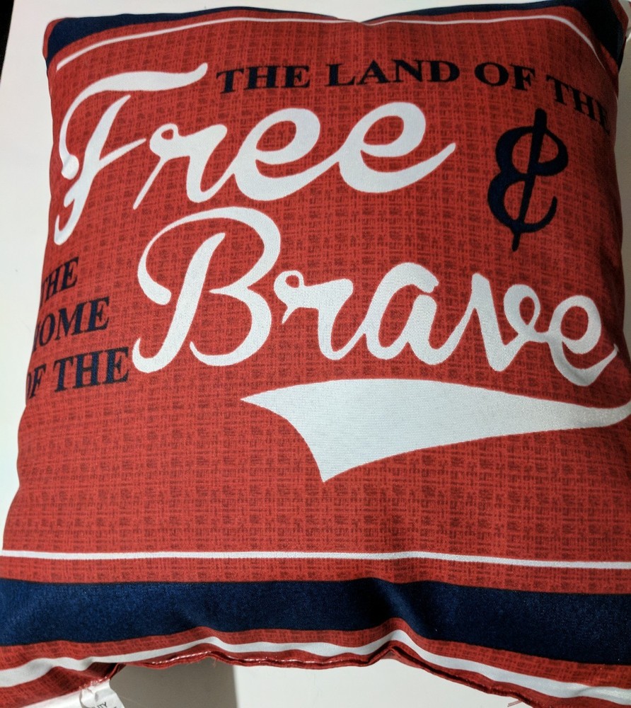 Land of the Free Home of the Brave Decorative Toss Pillow. Measures 16 X 16 X 5. Brand new with tags. Perfect indoor or outdoor with flame resistant and durable material.