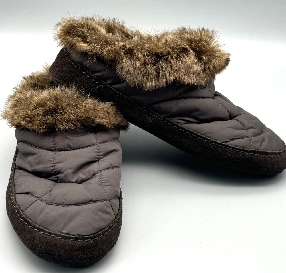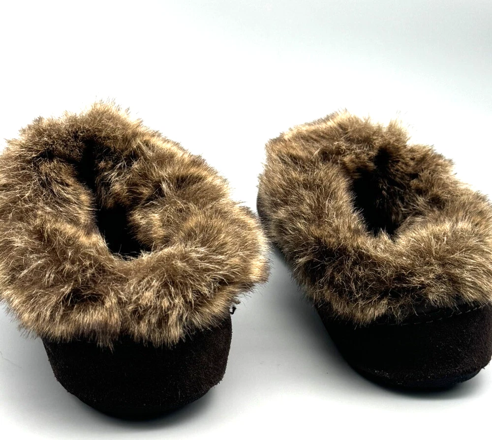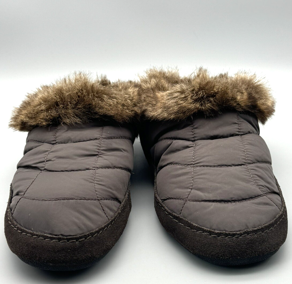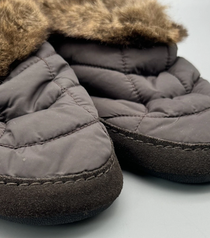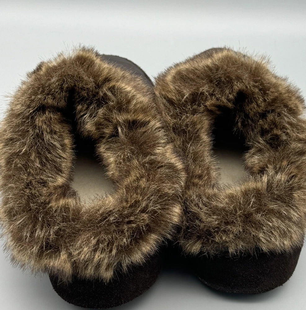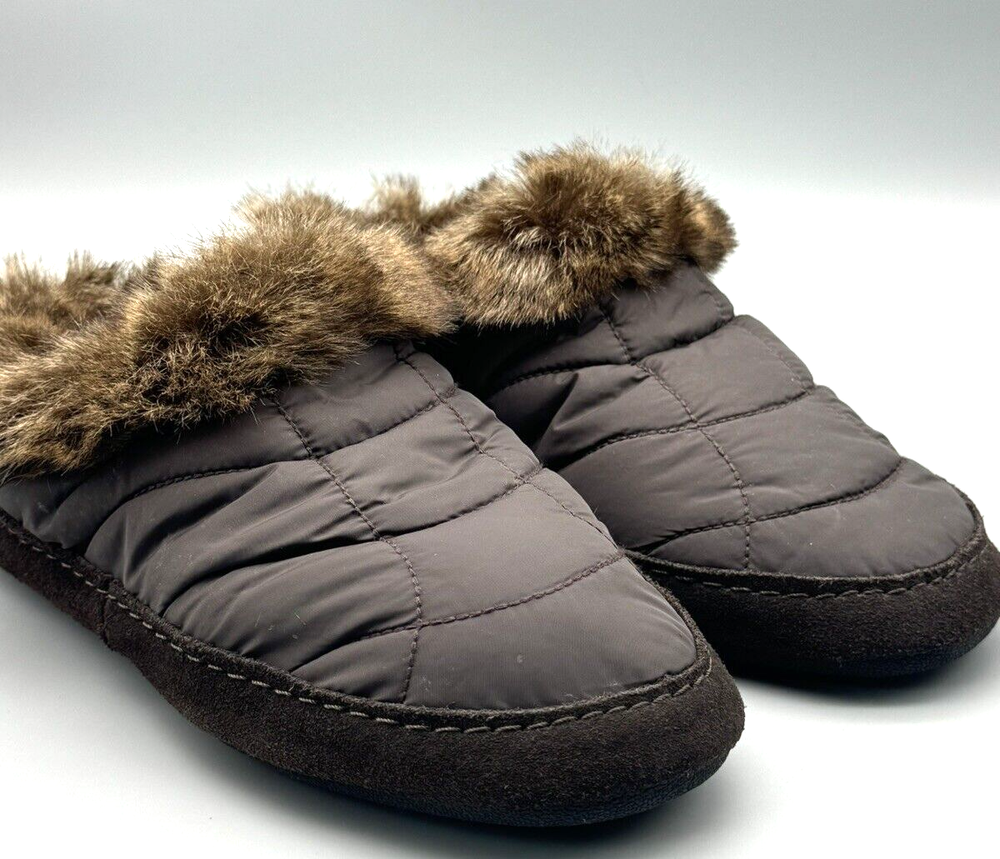 Women's Lands' End Slippers Brown Quilted Uppers with Brown Faux Fur Accents and Sueded Sides Slip On Style with Heel Coverage Size 9 B Lightly used with no flaws to mention. These look barely used, if at all. The photos are useful for seeing condition and other details.