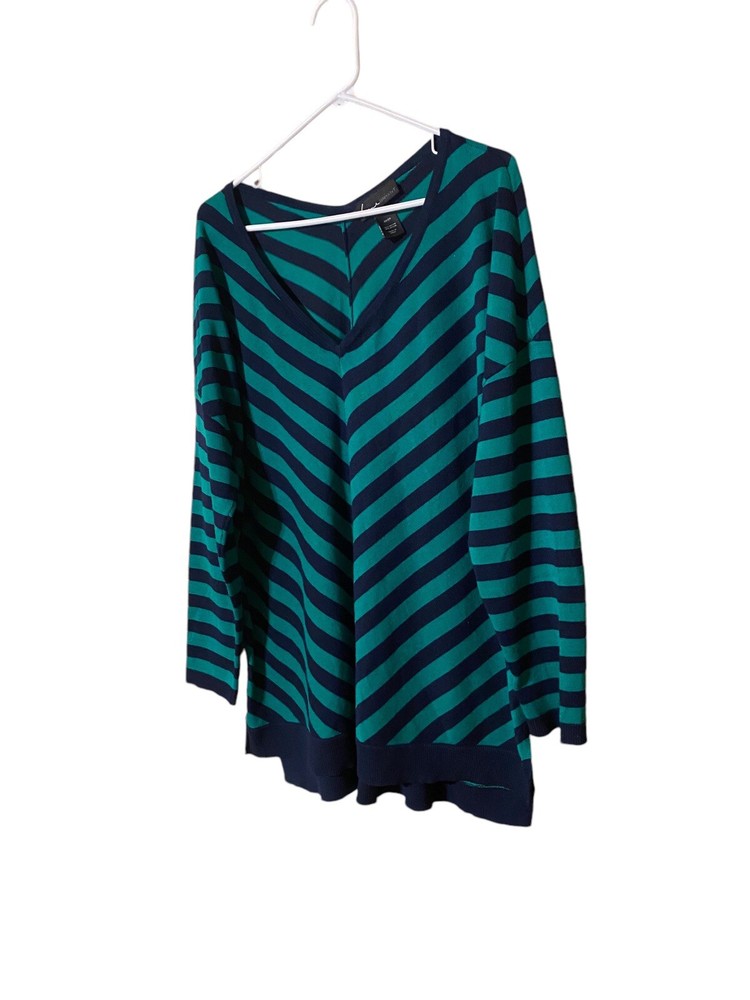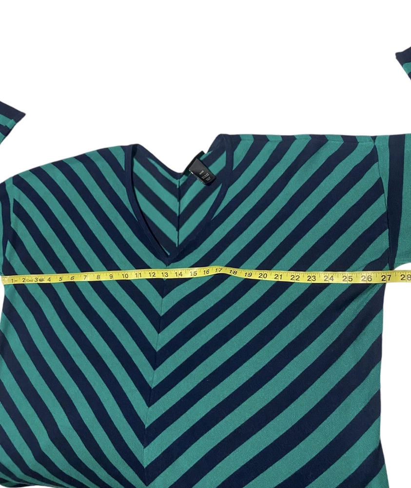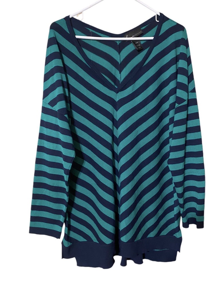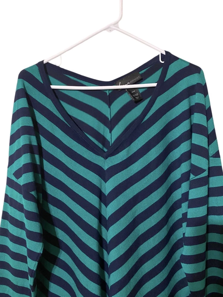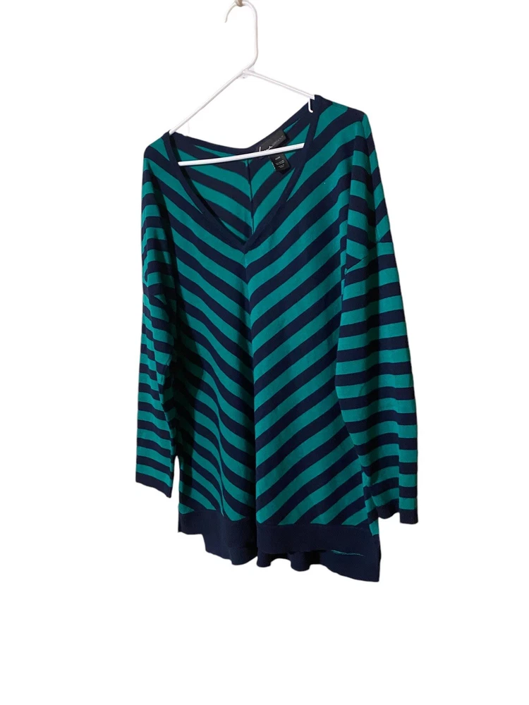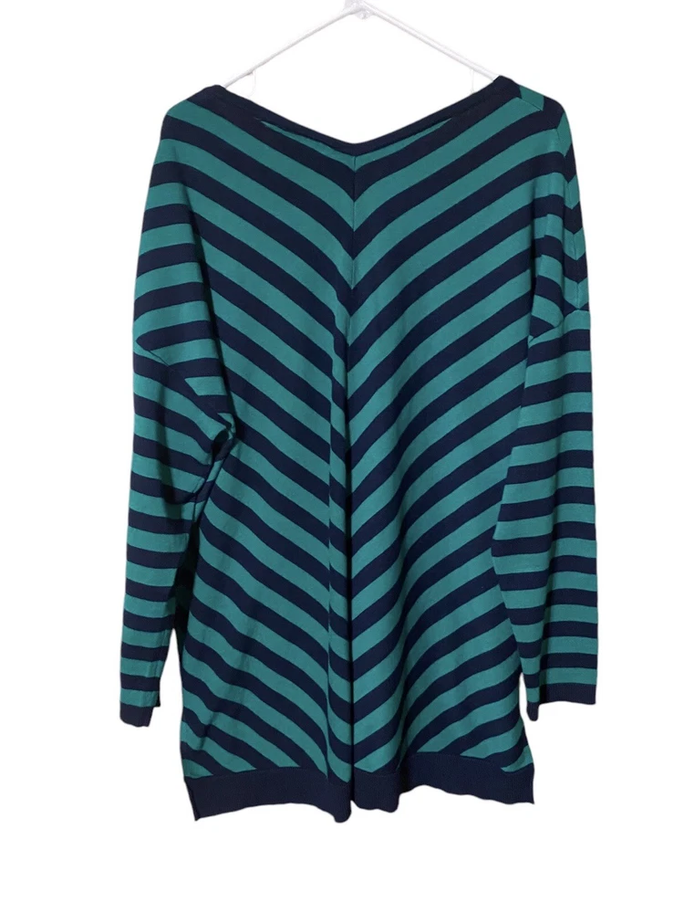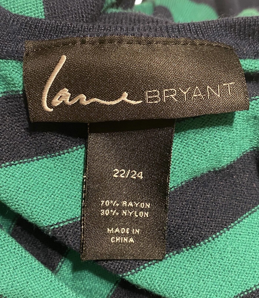 This Lane Bryant tunic sweater is perfect for any occasion, whether it's a casual day out or a business meeting. The black and green striped pattern adds a touch of leisure and comfort to your outfit. The tight-knit fabric is made of a blend of nylon and rayon, making it machine washable and easy to care for. With a V-neckline and long sleeves, this sweater is ideal for the cooler seasons of fall, winter, and spring. The regular fit and plus size type ensure a comfortable and flattering look for women. The sweater is branded by Lane Bryant and falls under the category of women's clothing, specifically sweaters.