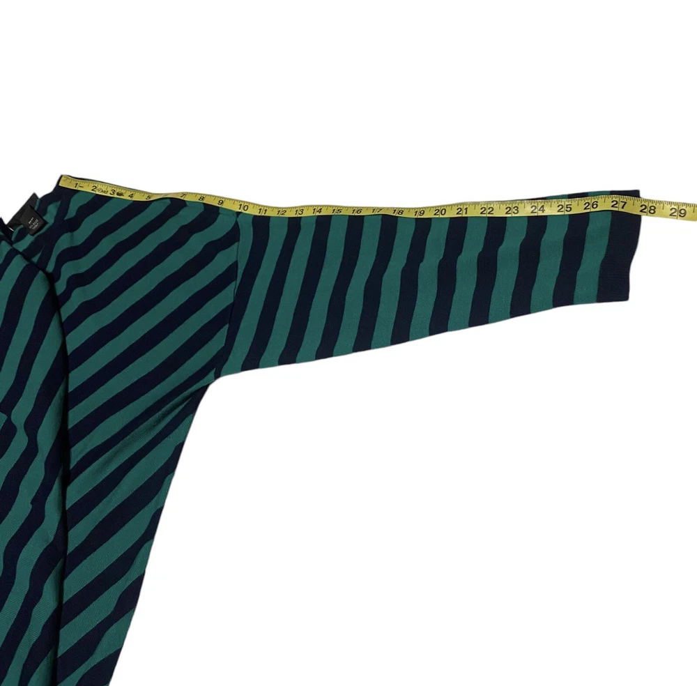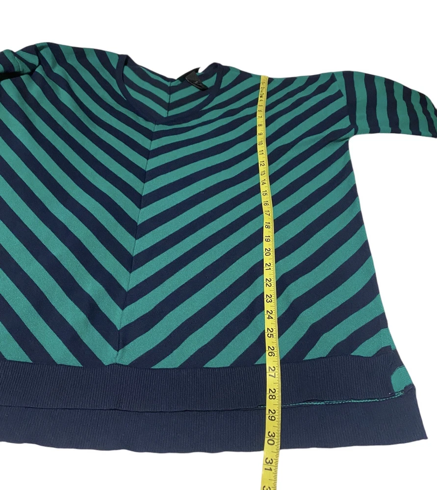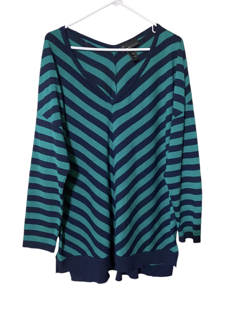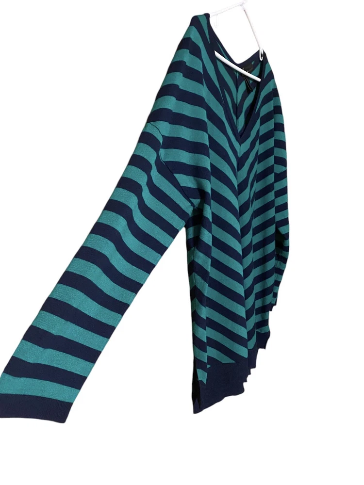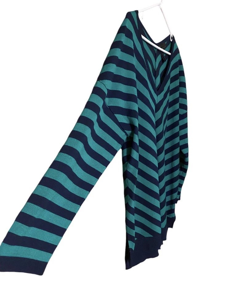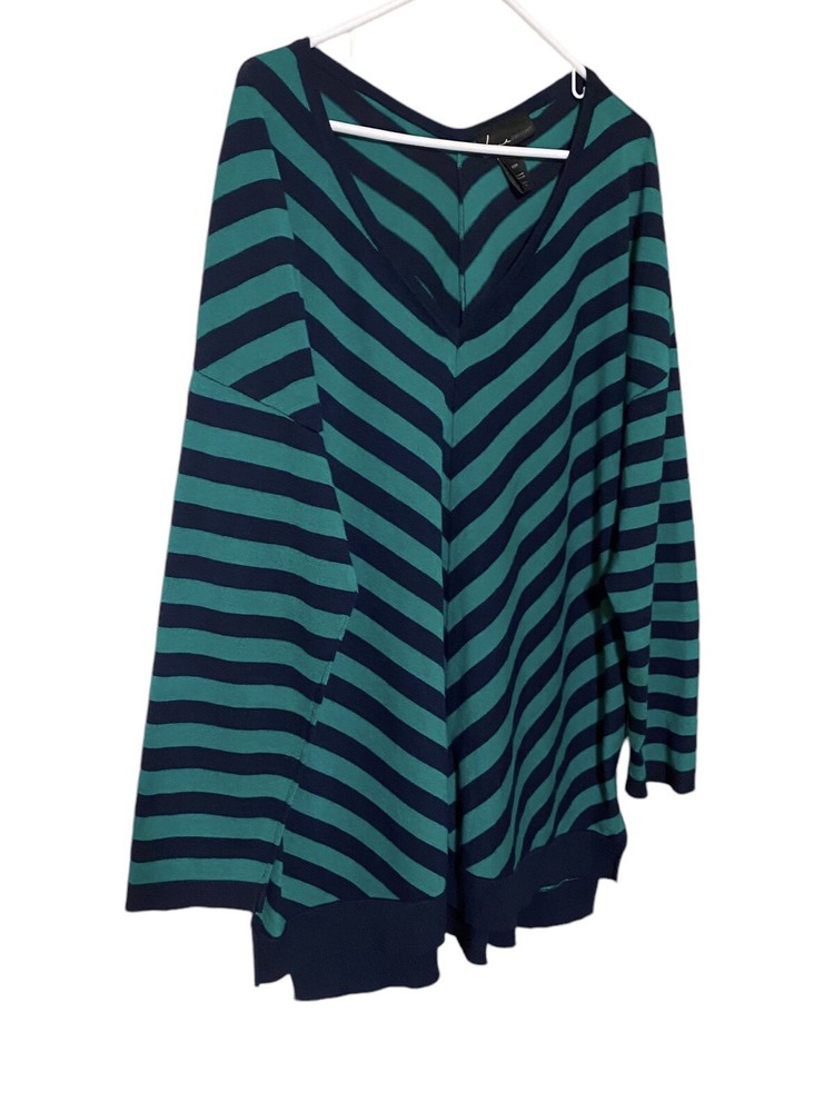 This Lane Bryant tunic sweater is perfect for any occasion, whether it's a casual day out or a business meeting. The black and green striped pattern adds a touch of leisure and comfort to your outfit. The tight-knit fabric is made of a blend of nylon and rayon, making it machine washable and easy to care for. With a V-neckline and long sleeves, this sweater is ideal for the cooler seasons of fall, winter, and spring. The regular fit and plus size type ensure a comfortable and flattering look for women. The sweater is branded by Lane Bryant and falls under the category of women's clothing, specifically sweaters.