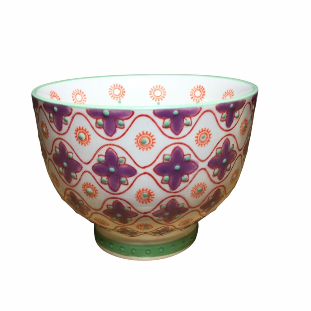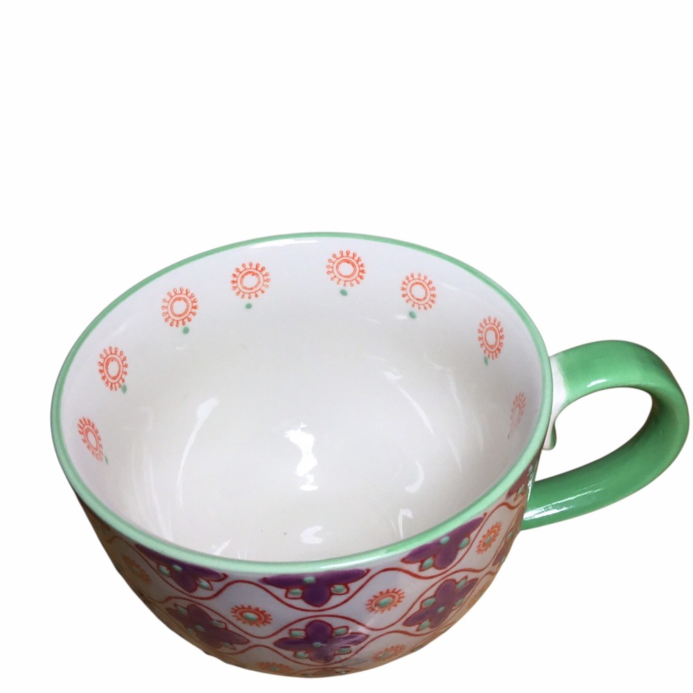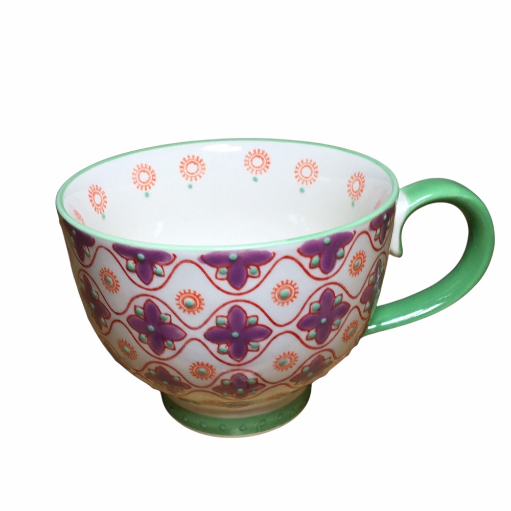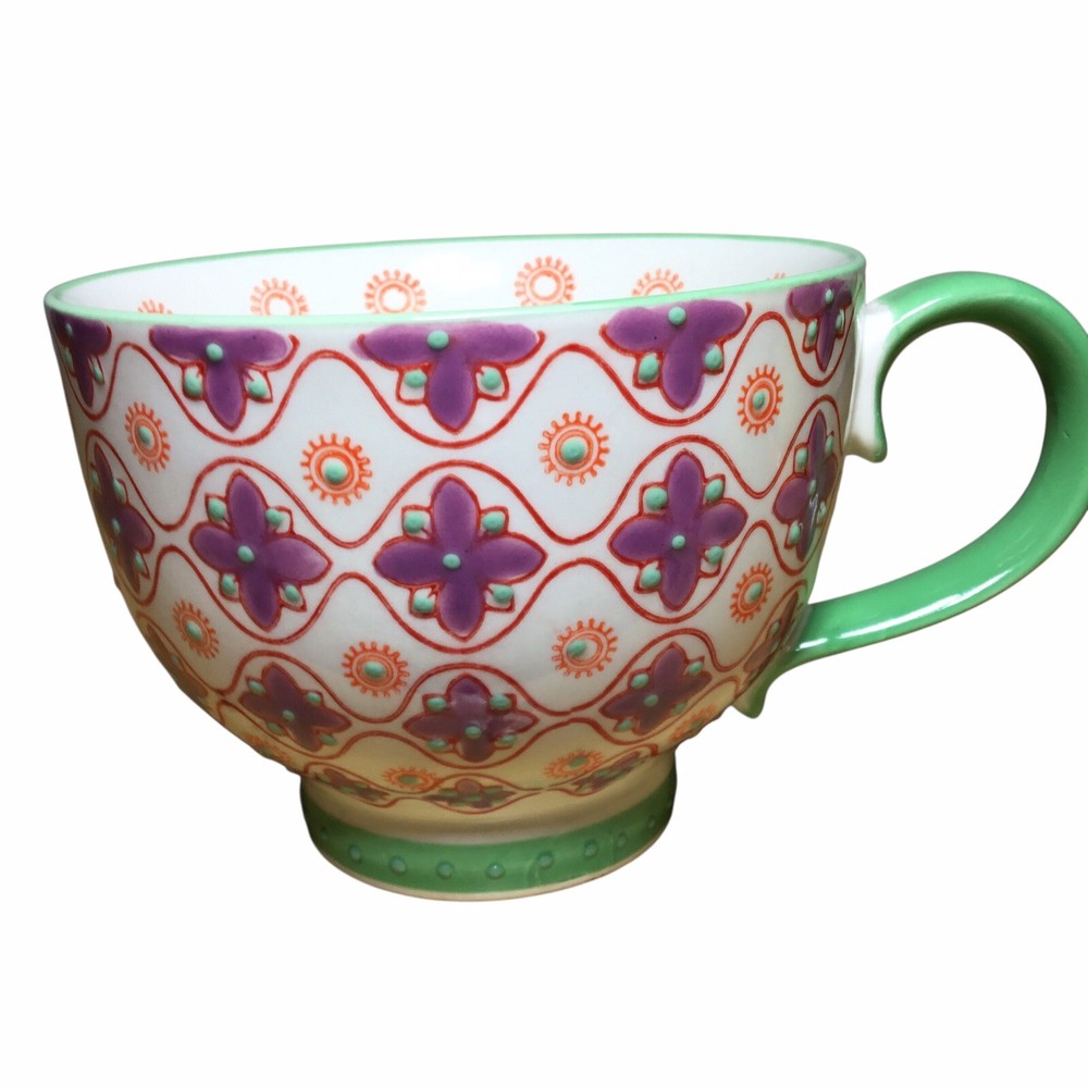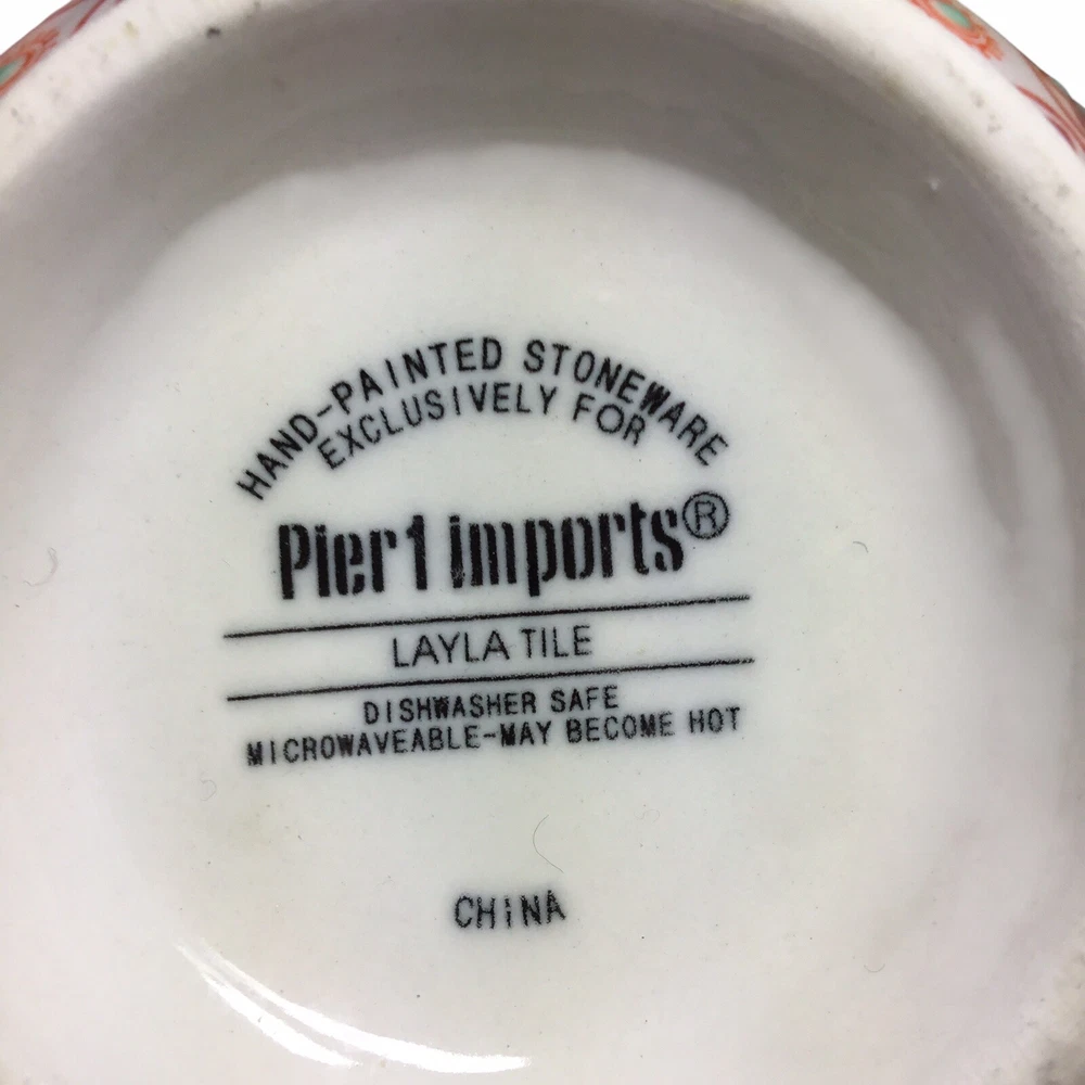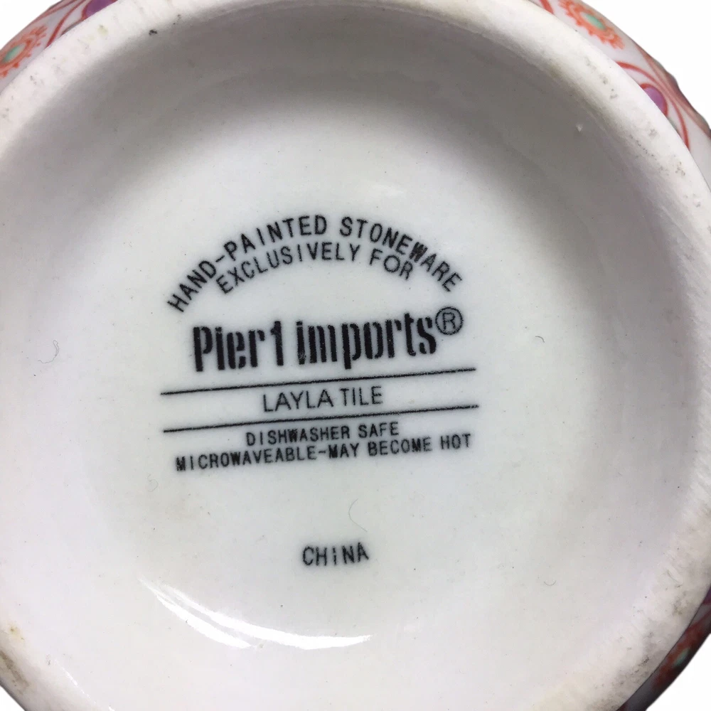 The Layla Tile Pier 1 Imports Mug is a unique and decorative hand-painted stoneware coffee mug with an embossed floral design. Created by Pier 1 Imports, this original piece features a multicolor floral pattern that adds a touch of elegance to your kitchen or dining area. Perfect for hot or cold beverages, this mug is a stylish and functional addition to any collector's assortment of dinnerware and serveware. Preowned Mint Condition Never Used