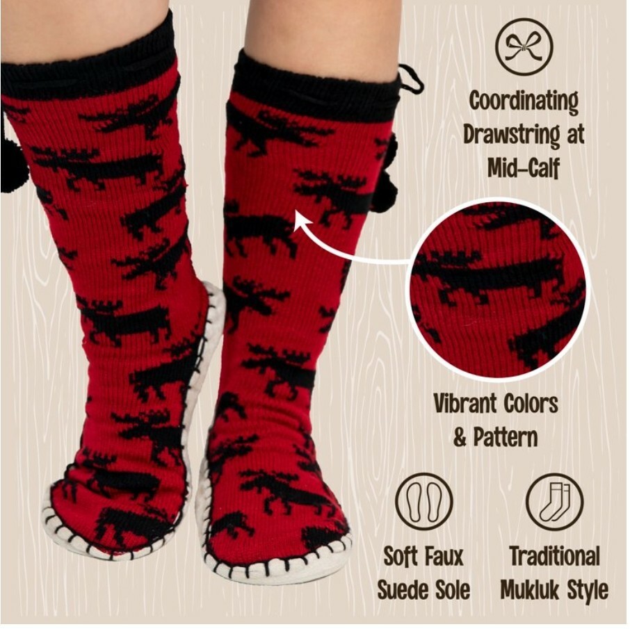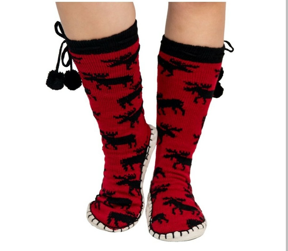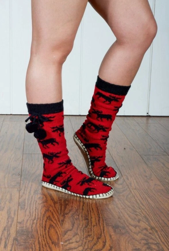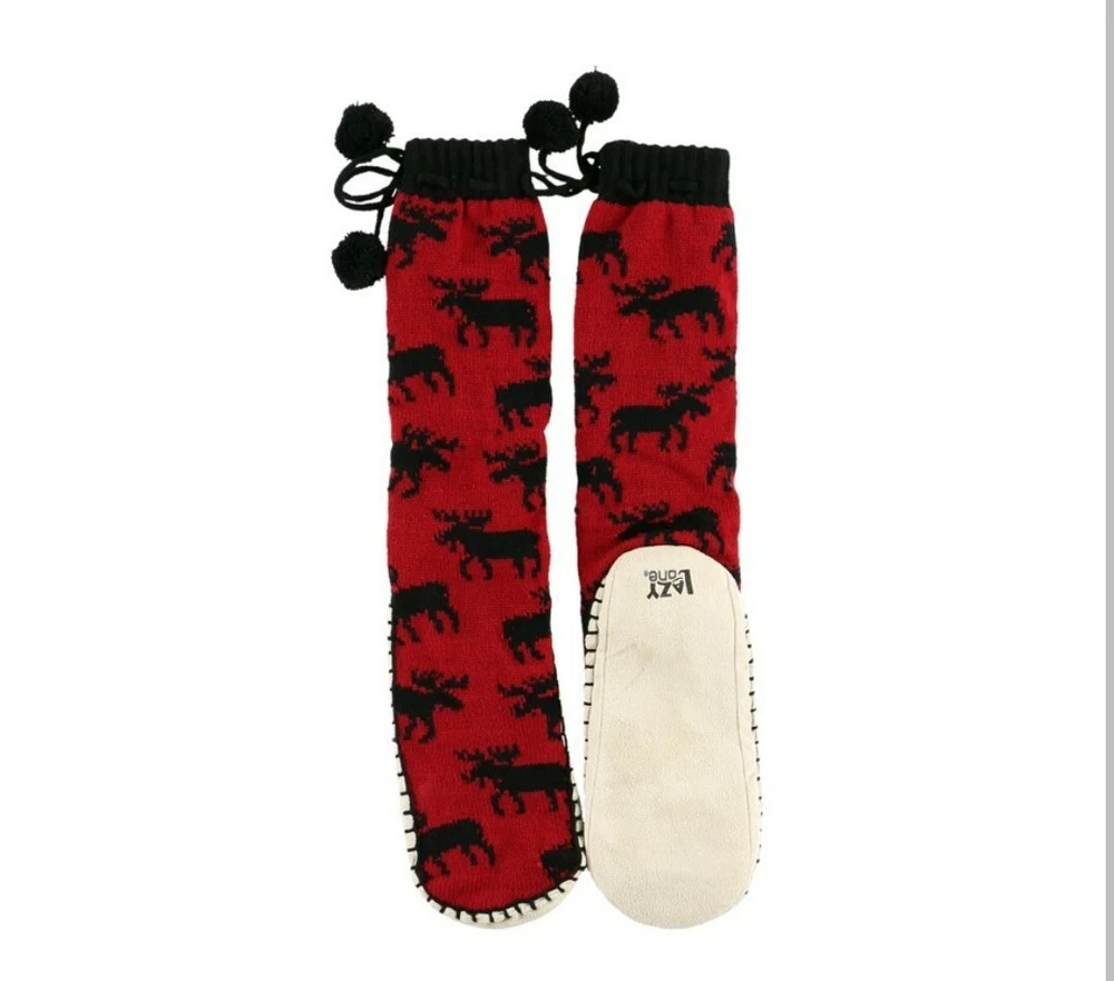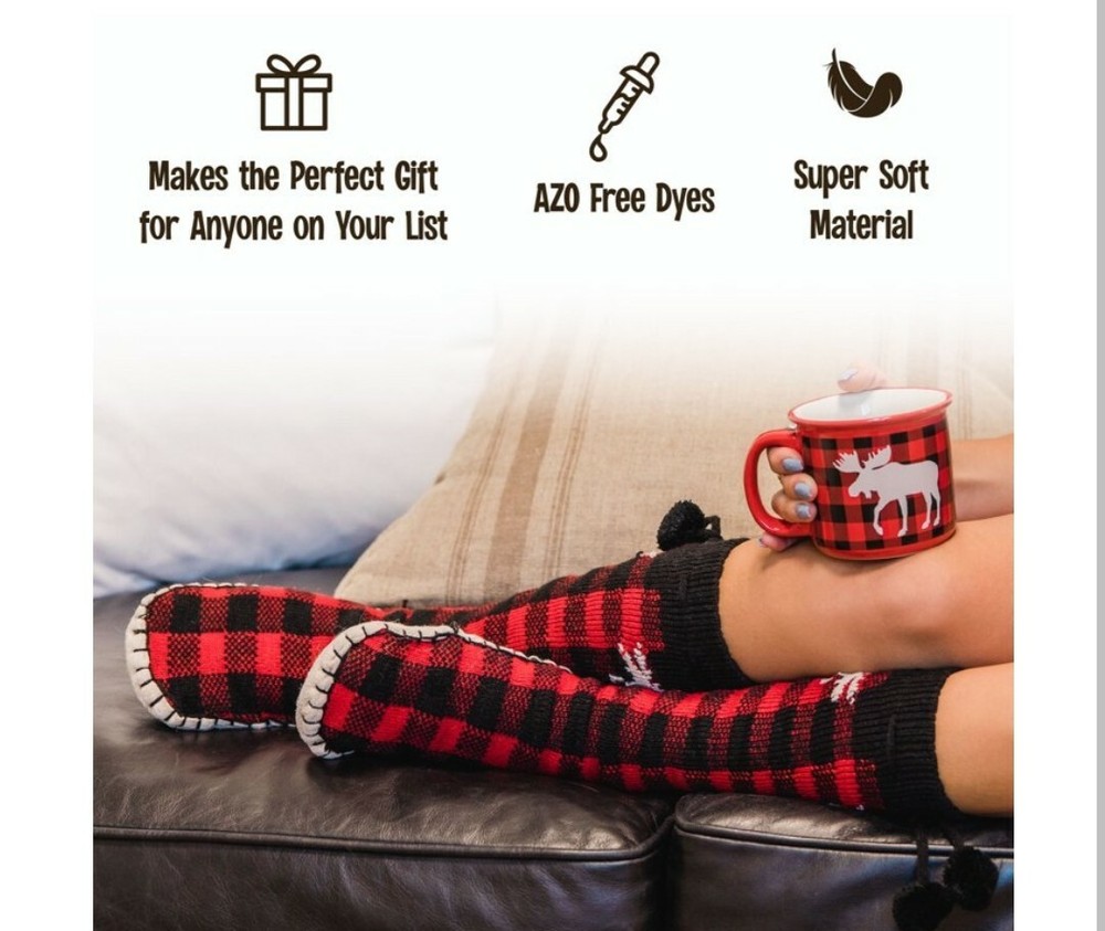 LazyOne Knitted Slipper Socks for Women, Classic Moose. S/M 4-7. Cozy Pampering Comfort. Stylish! Product details Give your feet a little pampering and some much-needed coziness with Women's Knitted Slipper Socks by Lazy One. These are perfect for lounging around the house, lazy Saturday mornings, sitting by the fire, staying warm on cold winter mornings, and cozying up for sleep. We believe that loungewear should look good and feel good, so our premium apparel is a must-have for any cozy-lover. These calf-high bootie socks are made from super-soft and warming knit fabric, so your toes can stay toasty all winter long. They are so luxurious, all you'll want to do is stay home and cuddle up! Inspired by the traditional footwear of the Inuit tribes, each slipper sock's faux-suede bottom is hand-stitched for an authentic look. Use the fluffy pompoms to keep these thick sleeping socks in place. Not only are these footies comfy and well-made, they are downright adorable, too. We offer them in a wide variety of rustic, adorable, and nostalgic prints. You'll feel like you're on a cabin retreat when you slip into a pair of these cozy moccasin-style slippers. If you are ready to make your holiday shopping list simple, get these adorable slipper socks for all of the wonderful women in your life, as they are sure to make them feel warm and fuzzy inside. These are ideal for birthdays, Christmas, Valentine's Day, Mother's Day, or just to say "I love you." You know you deserve to lounge in only the softest and warmest slipper socks. So what are you waiting for? Leave your frozen woes (and toes) behind with LazyOne's extra-cozy Knitted Slipper Socks! OH SO COZY: Say goodbye to cold toes and feet when you pop these on. These are ideal loungewear pieces and are as toasty warm as they are cute. Get ready to step into luxury. CUTE PRINTS: Better than a boring tube sock, these precious knitted slipper socks come in adorable, rustic prints. You'll feel cute and comfortable all day long. PERFECT GIFT: Once you get a pair for yourself, you'll want to get them for everyone on your Christmas list. These are great for Christmas, birthdays, Mother's Day, Valentine's Day, and so much more. HIGH QUALITY: We strive to use only the highest quality of Acrylic in our products, and it is all made with care. You'll notice the difference with LazyOne apparel. SAFE FOR YOUR FAMILY: LazyOne is committed to only using AZO-free dyes and nontoxic materials to keep your family happy, healthy, and safe.