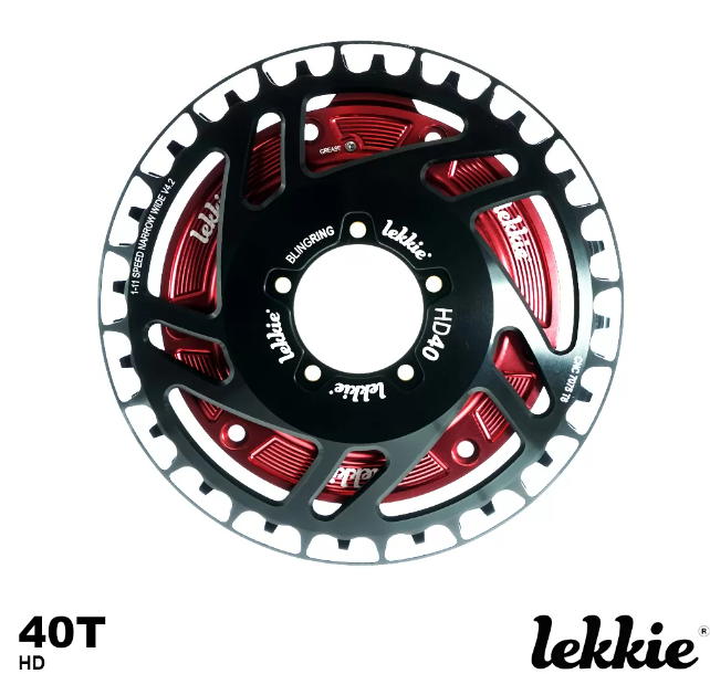 LEKKIE BLING RING 40T HD PACKAGE The Lekkie Bling Ring 40T is now the smallest tooth count ring available on the market that maintains the correct offset and chain line. Lekkie made this possible by also designing the motor drive covers to work together with the 40T ring to create the most compact offset drive ring. The Bling Ring 40T V4 also launches MULTISPACE. The MULTISPACER allows you to set 3 different offsets. To get the current BlingRing offset key the MULTISPACER into the back of the sprocket. However if you require 2.5mm extra offset just remove it. If you need to space the ring 2.5mm out to clear your frame then simply flip the spacer the other way. This gives 5mm adjustment with one spacer! The 40T ring also sports a external chain guide ring to give another level of chain retention and protect your pants from engaging the chain. To be able to run a 40T you must run the Lekkie DRIVECOVER. The 40T package includes the 40T Ring, MULTISPACER and DRIVECOVER. 40T Installation video: Click Here Material CNC 7075 T6 Alloy Finish Anodised Black, Red Size 40T Offset 15.8-20.8mm – see User Manual for details Weight TBC Compatibility 1-11 speed (most chains), Sram 12 speed Motor BBSHD
