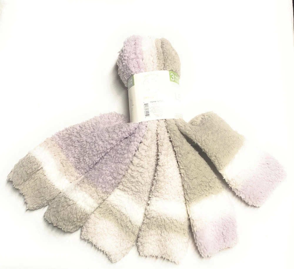 Purple pack contains (1) Purple, (1) Light Gray, (1) Gray Feather lining and cuffs Recycled polyester Ultra-Soft Warm and cozy Made in China Content: 66% Recycled Polyester | 32% Polyester | 1% Spandex | 1% Rubber Sizing: Fits Ladies' Shoe Size: 5 - 9.5